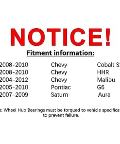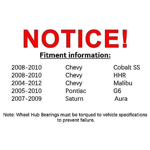 Conjunto de Buje y Rodamiento de Rueda delantera nuevo y de alta calidad con ABS para Chevy Malibu 06-12 Pontiac G6 05-10 Aura 07-09 Cobalt SS/HHR SS (2 PCS) de MAYASAF. Este conjunto de buje y rodamiento de rueda está diseñado para una compatibilidad exacta con los siguientes vehículos: Chevrolet Cobalt SS 2008-2010 (5 tuercas, c/ABS), HHR SS 2008-2010 (5 tuercas, discos traseros), Malibu 2004-2012 (04-07: Modelos con ABS, excluye Malibu Classic), Pontiac G6 2005-2010 (05-09: Modelos con ABS) y Saturn Aura 2007-2009.