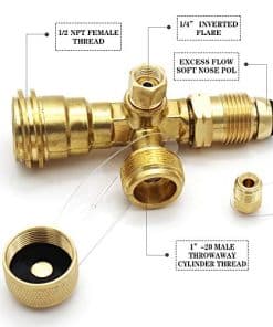 El conector de propano en T de latón MCAMPAS con adaptador de 4 puertos es ideal para motorhomes con tanques permanentemente instalados, permitiendo la alimentación de gas propano a múltiples electrodomésticos al mismo tiempo. Puede utilizarse para abastecer de propano a su parrilla, calentador, estufa, vehículos y más. Este adaptador de propano es ligero y portátil, permitiendo el uso de hasta 3 aplicaciones de propano con un solo tanque. Incluye una válvula de seguridad, un sujetador de latón y una junta de goma para sellar las válvulas. Fabricado en latón duradero, este conector de propano está diseñado para resistir un uso prolongado y repetido en su sitio de campamento.