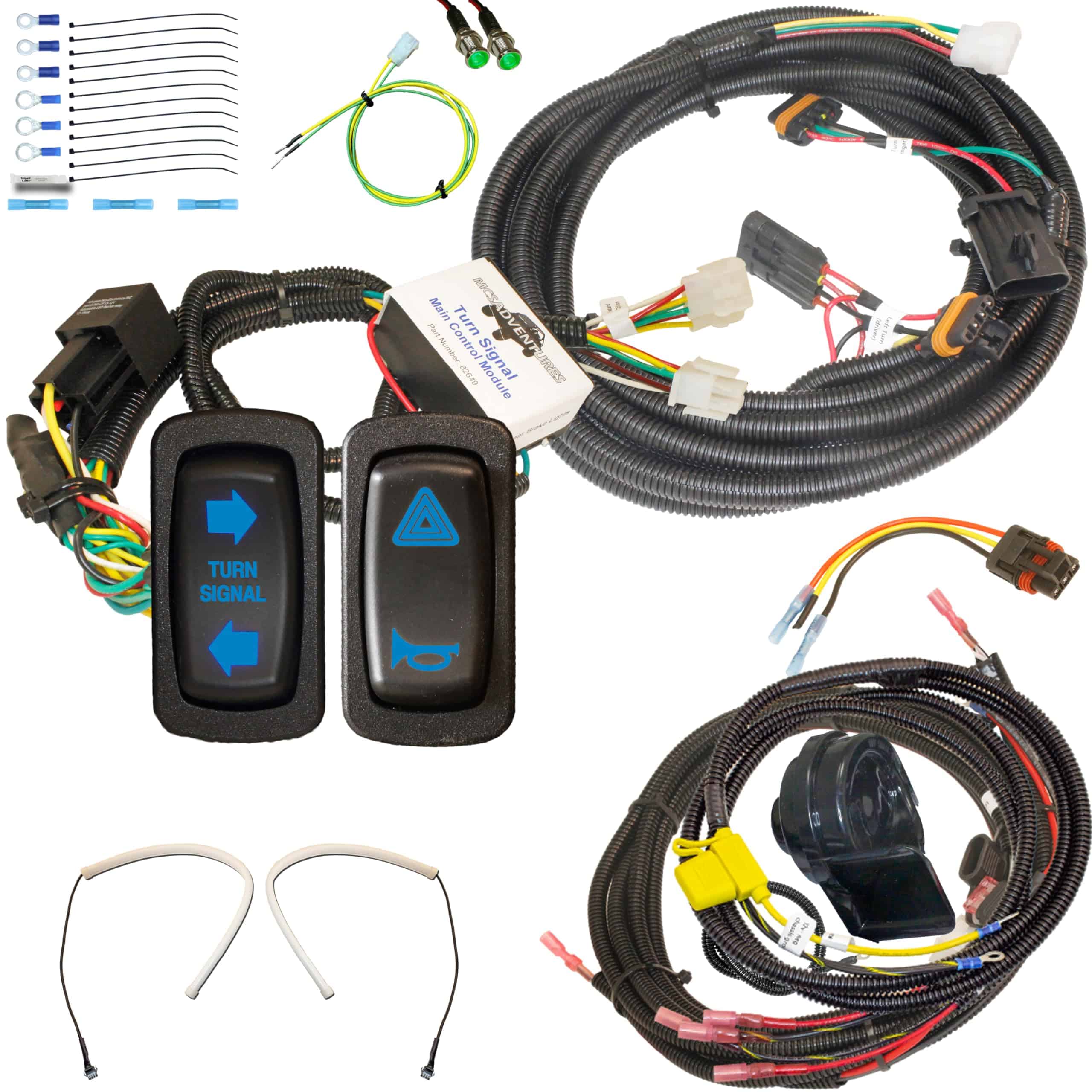También se incluye un completo kit de combinación de peligro/claxon a juego. Esto reduce el desorden en tu tablero mientras te proporciona todas las campanas y silbatos. El arnés pre-cableado simplemente se conecta al arnés principal de las señales de giro. Se incluye un claxon de camión automotriz verdaderamente ruidoso. Este no es el claxon tipo juguete que escuchas de la moto al lado. ¡Amigos, este claxon despertará a tus vecinos!