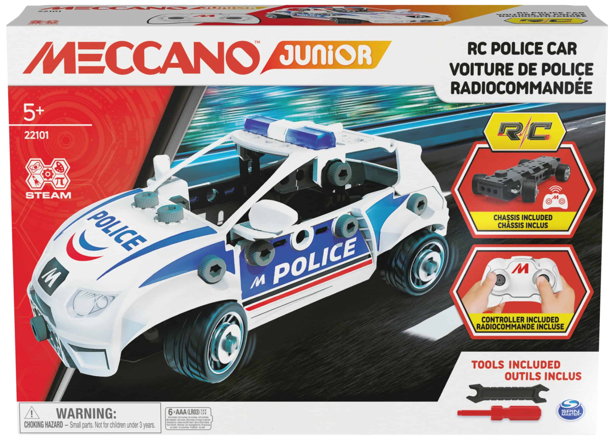 ¡Crea tus propias aventuras llenas de acción Meccano Junior con el Coche de Policía RC! ¡Este conjunto de construcción STEM Meccano Junior con control remoto! tiene todo lo que los niños necesitan para construir su propio coche de policía de control remoto con maletero funcional. El Coche de Policía RC viene con 73 piezas, un chasis, dos herramientas, dos hojas de pegatinas, una hoja de instrucciones y un controlador fácil de usar, perfecto para niños y principiantes. ¡Es tan fácil de construir con Meccano Junior! Coloque tuercas en las piezas para que se bloqueen y use los pernos para mantener las piezas juntas. ¡Elige entre los dos conjuntos diferentes de pegatinas para personalizar completamente tu vehículo, luego usa el controlador para conducir hacia adelante y hacia atrás y girar a la izquierda y a la derecha! Con una frecuencia de 2.4GHz, puedes controlar tu coche de control remoto Meccano Junior desde una distancia de hasta 100 pies. ¡Con el Coche de Policía RC Meccano Junior, crear tus propias misiones de rescate nunca ha sido tan divertido! ¡Levanta y baja el maletero y guarda figuras de acción u otros juguetes dentro, luego corre hacia la próxima escena! Para más formas de construir y jugar, el chasis del Coche de Policía RC se puede combinar con otros conjuntos Meccano Junior (cada uno se vende por separado). El Coche de Policía RC Meccano Junior ofrece una experiencia de construcción desafiante pero gratificante que los pequeños constructores y los adultos pueden disfrutar juntos. A medida que los niños ensamblan su RC, aprenderán cómo se aplican los principios de la ciencia, la tecnología, la ingeniería y las matemáticas de manera práctica, mientras fortalecen la coordinación mano-ojo, la resolución de problemas y las habilidades motoras finas. Requiere 6 pilas AAA (4 para el vehículo, 2 para el controlador), no incluidas. Los kits STEM de Meccano Junior (juguetes se venden por separado) son excelentes regalos de cumpleaños, regalos de Navidad o regalos para niños de 5 años en adelante para cualquier ocasión. ¡Lleva a casa el Coche de Policía RC y lleva tus construcciones de Meccano Junior al siguiente nivel!