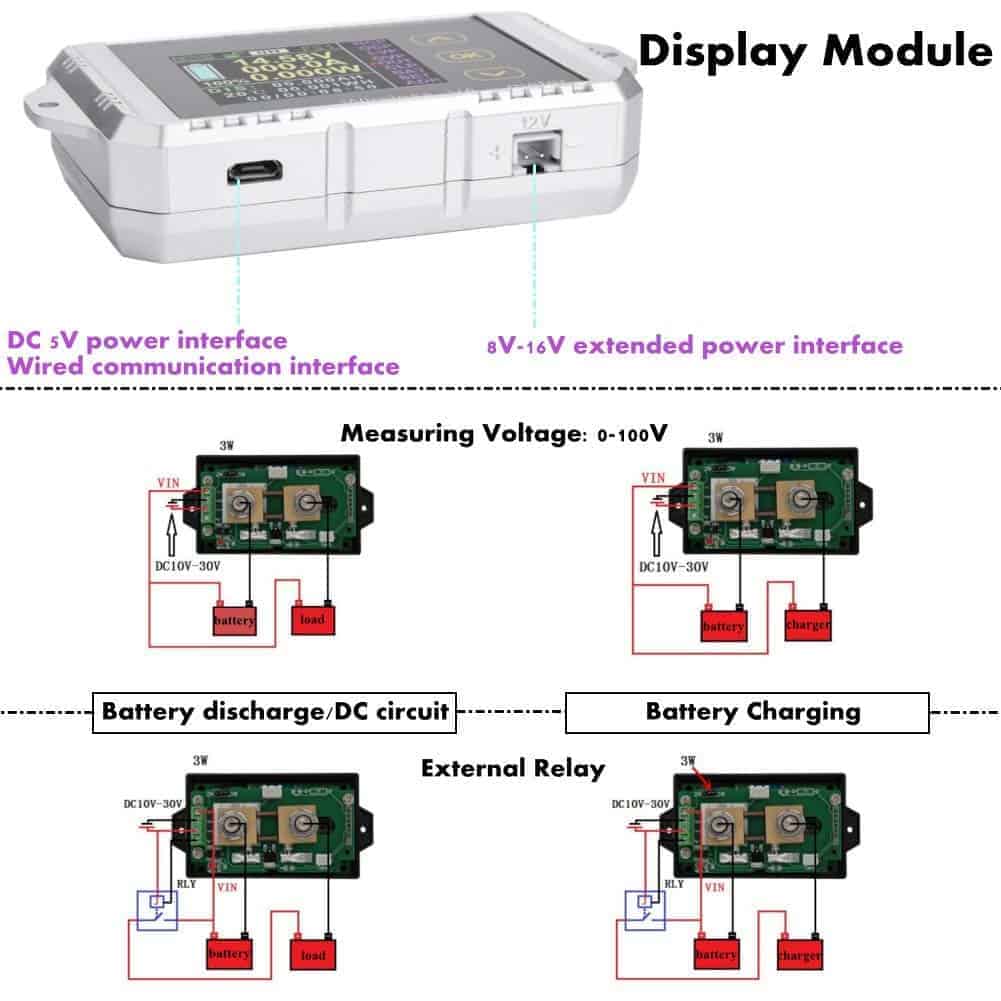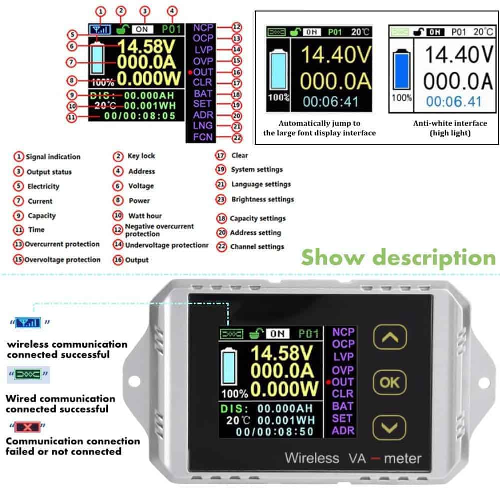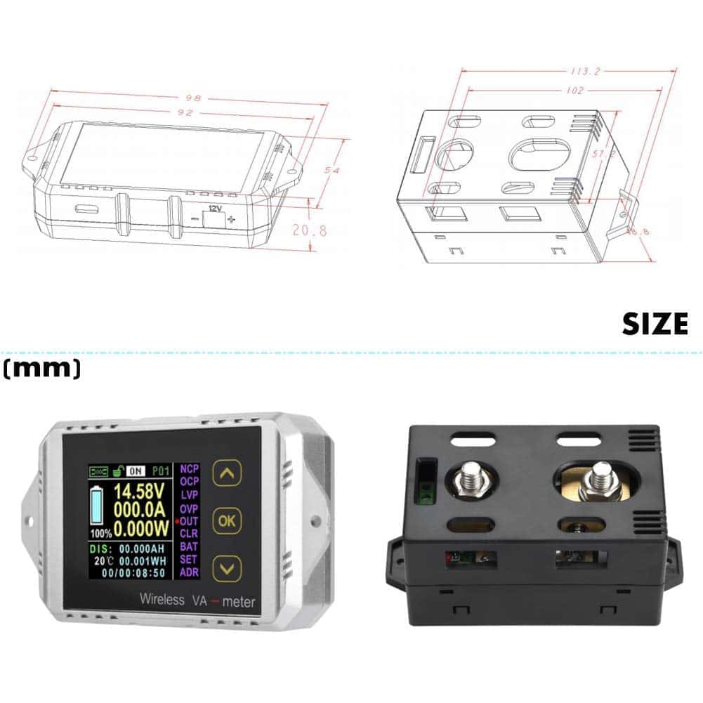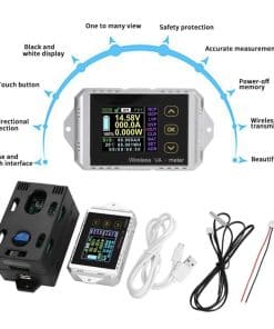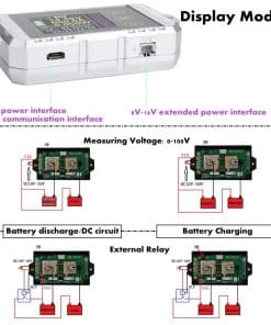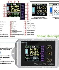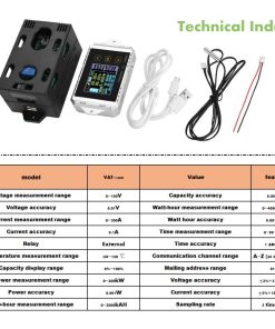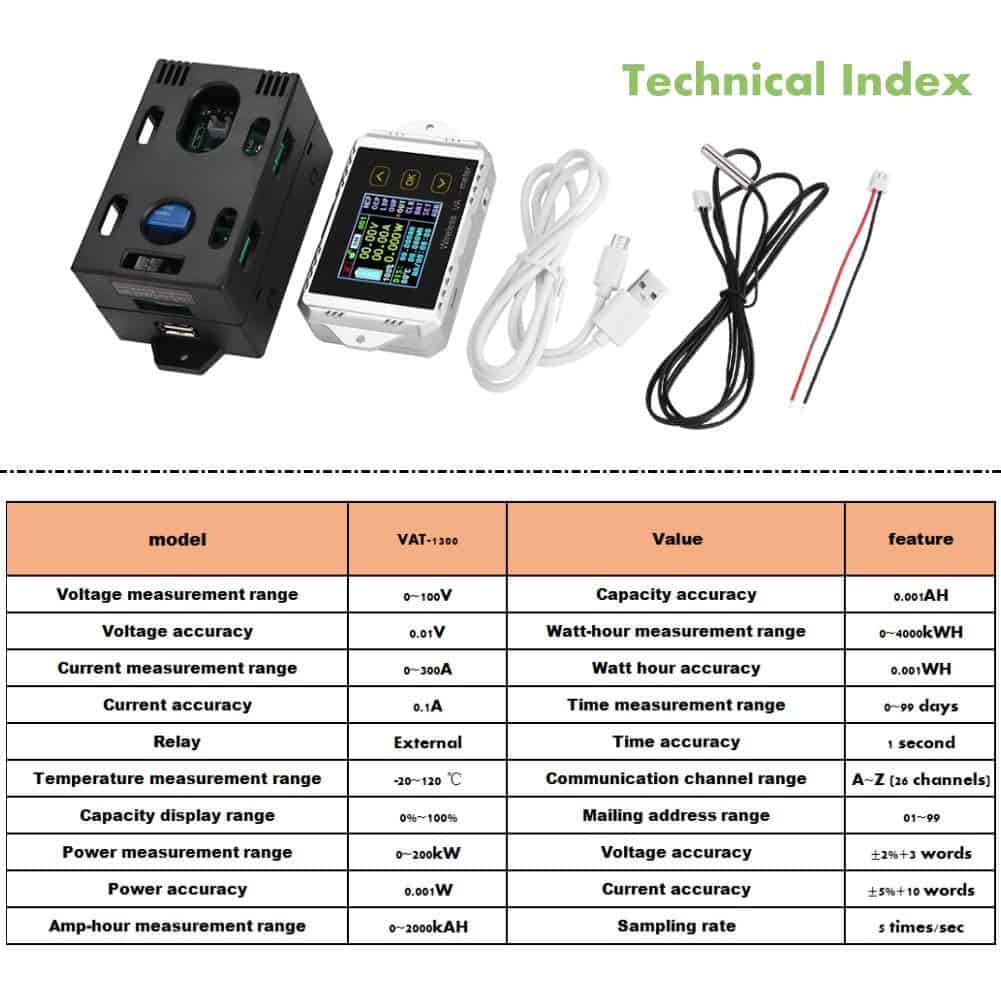 Modelo (Opcional) VAT-1050 VAT-1100 VAT-1200 VAT-1300 VAT-4300 Rango de medición de voltaje 0~100V 0~100V 0~100V 0~100V 0~400V Resolución de voltaje 0.01V 0.01V 0.01V 0.01V 0.1V Rango de medición de corriente 0~50A 0~100A 0~200A 0~300A 0~300A Resolución de corriente 0.01A 0.1A 0.1A 0.1A 0.1A Relé Externo Temperatura Rango de medición de -20~120 Capacidad de visualización 0%~100% Rango de medición de potencia 0~200kW Resolución de potencia 0.001W Rango de medición de AH 0~2000kAH Resolución de capacidad 0.001AH Rango de medición de vatios-hora 0~4000kWH Precisión de vatios-hora 0.001WH Rango de tiempo de medición 0 ~ 99 días Resolución de tiempo 1 segundo Rango de canal de comunicación A ~ Z (26 canales) Rango de canal de comunicación 01~99 Precisión de voltaje 2% + 3 palabras Precisión de corriente 5% + 10 palabras Tasa de muestreo 5 veces / segundo Distancia de comunicación hasta 10 metros Consumo de energía del módulo de medición Alrededor de 0.4W Consumo de energía del módulo de visualización 0.5W NCP 0 ~ 300A (ajuste de protección contra sobrecorriente negativa) OCP 0 ~ 300A (ajuste de protección contra sobrecorriente positiva) OVP 0 ~ 100V (ajuste de protección contra sobretensión) LVP 0 ~ 100V (ajuste de protección contra subtensión) tiempo de retardo de protección 0 ~ 10s Peso
