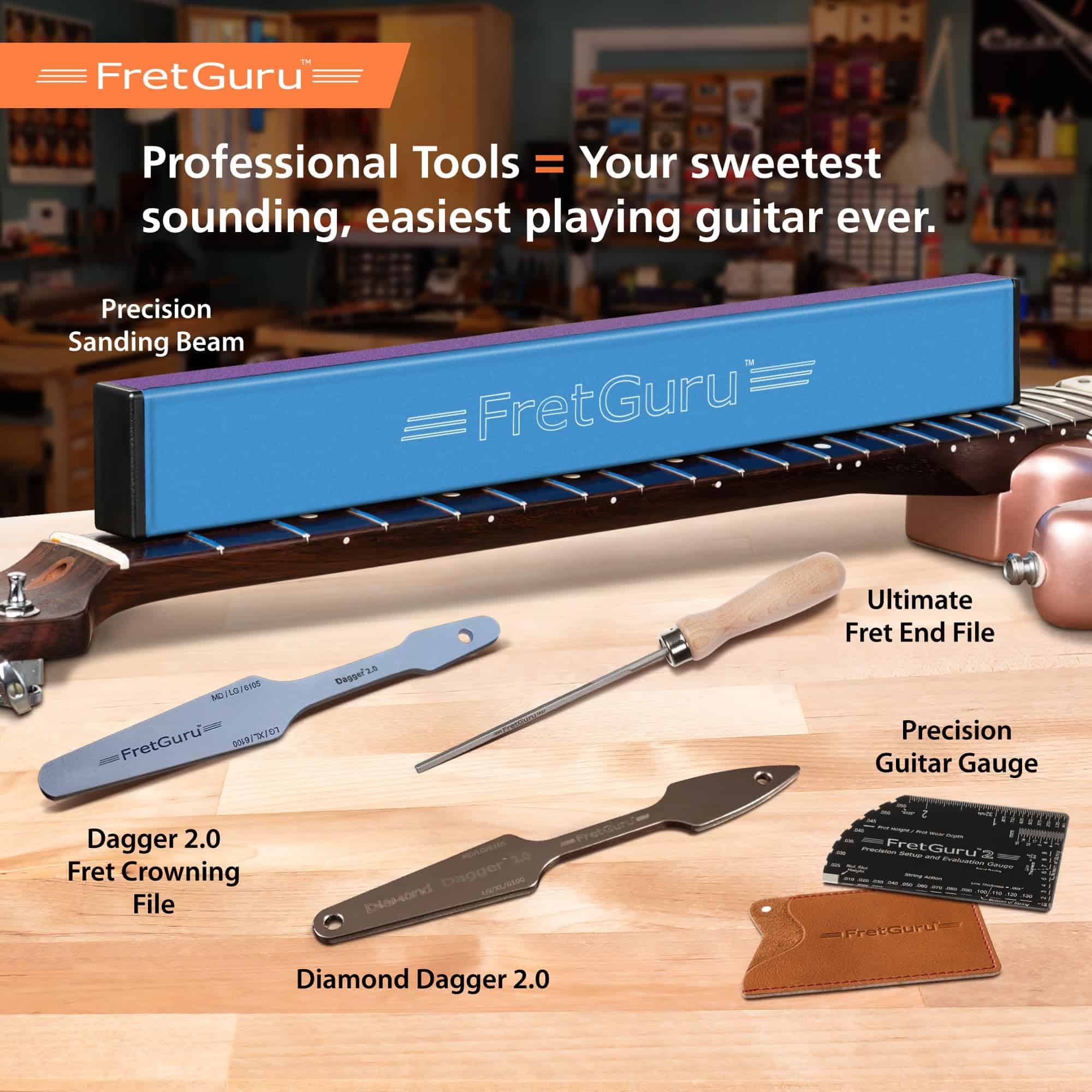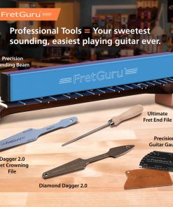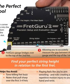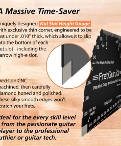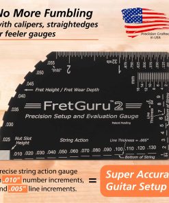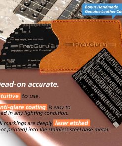 1. Medidor preciso de acción de cuerdas en .010″ (diez milésimas de pulgada) incrementos de número, e incrementos de línea de .005″ ¡ajuste de guitarra súper preciso! ¡Las marcas NO están impresas, están grabadas con láser a través de la superficie negra, profundamente en el metal inoxidable. ¡No hay impresión que se borre! También echa un vistazo al nuevo medidor de acción de cuerdas de precisión 64avos. La precisión del FretGuru 2 llevará tu guitarra fuera del reino de la carpintería y a otro mundo de tocabilidad. n2. Medidor de altura de trastes/desgaste de trastes único, en incrementos de .005″. No más rebuscar con calibradores, reglas o calibres de espesores. n3. ¡Fret Rocker! Los 3 lados de longitud desigual están mecanizados por CNC, afilados con diamante de precisión y pulidos. Ahora puedes encontrar ese traste alto molesto sin rayar tus trastes. n4. Otro primero: el medidor de altura de ranura de cejuela con diseño único, que ya ha sido un gran ahorro de tiempo aquí en el banco de trabajo. Notarás el cuadrado plateado en la esquina inferior del medidor. Esta esquina está diseñada y fabricada para tener un grosor de casi .010″, lo que le permite deslizarse en cada ranura de la cejuela, incluida la estrecha ranura del mi. n5. Simplemente coloca la esquina delgada en la parte inferior de cada ranura de la cejuela – y el otro extremo en el 2º traste, luego mide la brecha a medida que pasa sobre el 1er traste. Nunca ha sido más fácil centrarse en la altura perfecta de la cuerda cuando sale de la cejuela. ¡También asegúrate de consultar la lista separada para el dulce estuche de cuero hecho a mano! Haz doble clic en las fotos para verlas ampliadas.