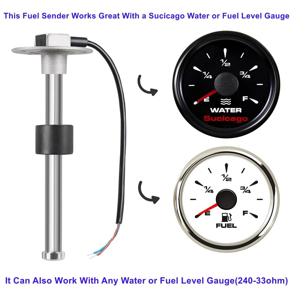 Este sensor de combustible también funcionará con cualquier medidor de nivel de combustible/agua con rango de señal de salida estándar americano de 240-33 ohmios.