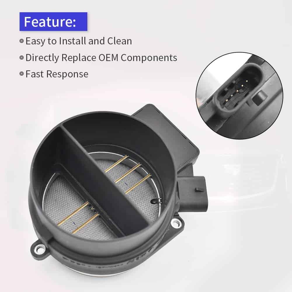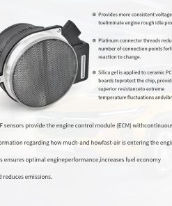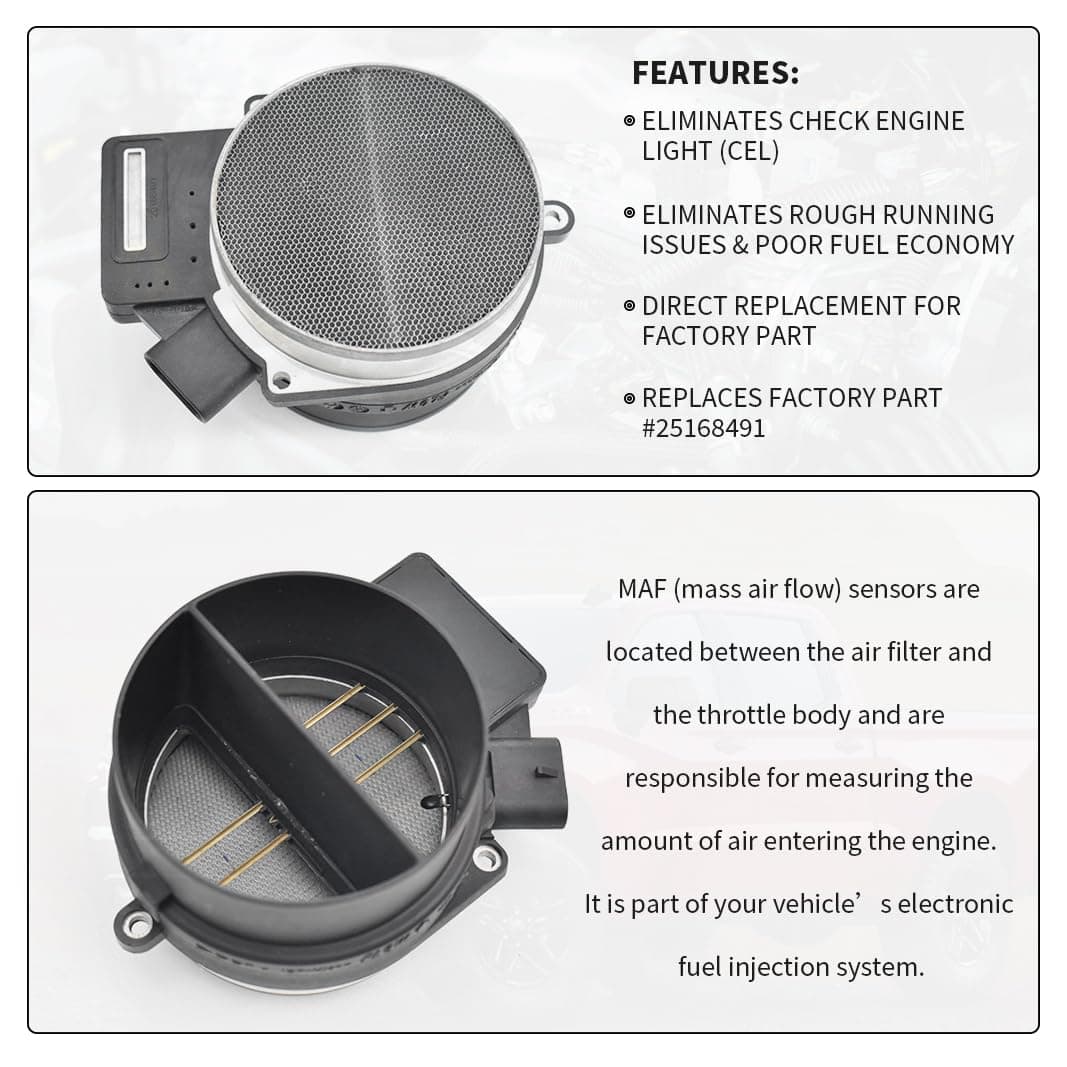 Si tu vehículo funciona de manera irregular, tiene problemas de aceleración o presenta un bajo rendimiento de combustible, es posible que tengas un problema con tu sensor de flujo de aire. El sensor se puede encontrar fácilmente junto al cuadro de admisión de aire dentro del compartimento del motor. Reemplaza los siguientes números de parte: AF10043, 25318411, 25168491, 213-4160, 2134160, 213-364, 213364, 15904068, MF8411, 28411M, 748411, 868411, SU1287 8253184110, SU9516. APLICACIÓN: Por favor, verifica las aplicaciones y el número de parte antes de hacer pedidos.