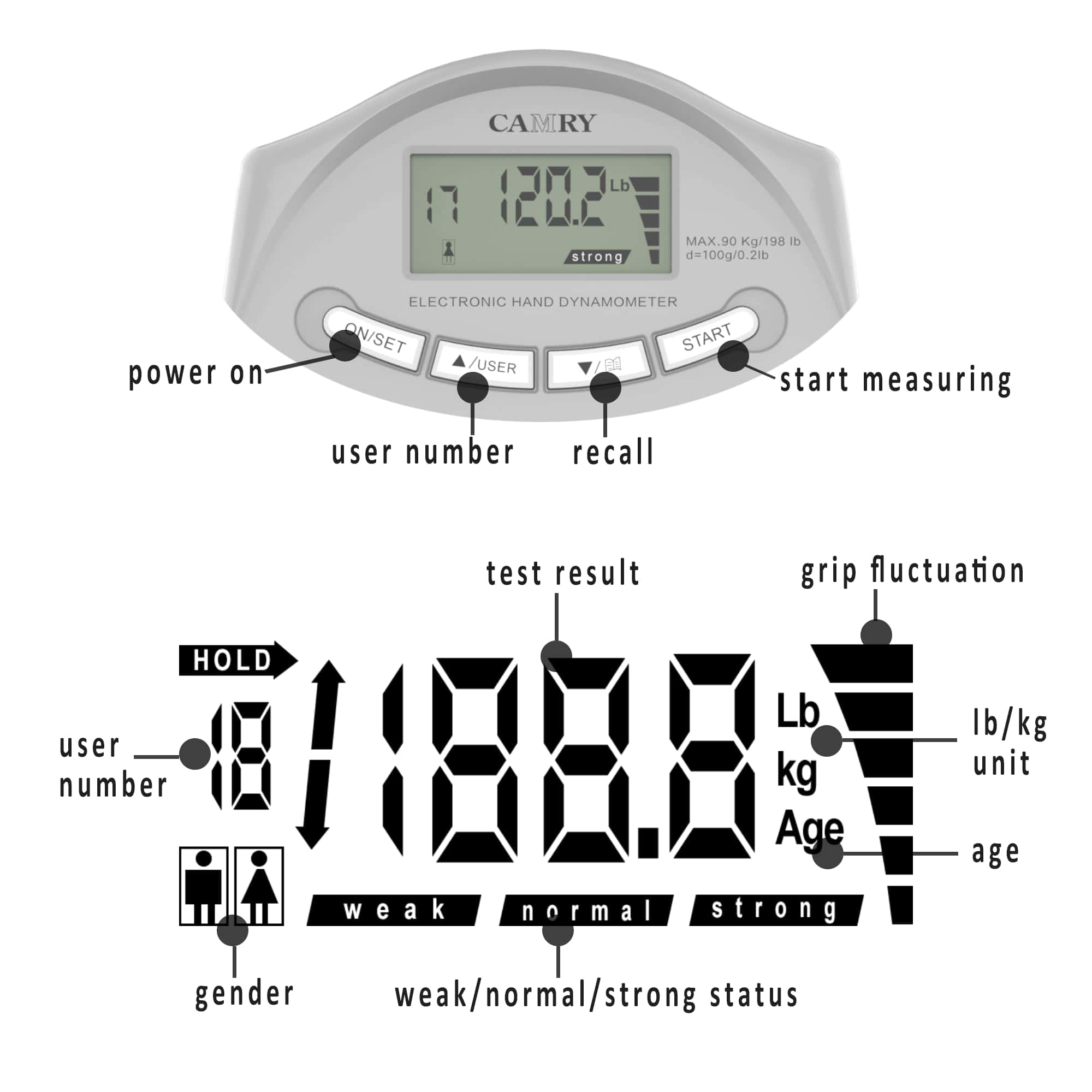 Medidor de Fuerza de Agarre Digital CAMRY 198Lbs / 90Kgs