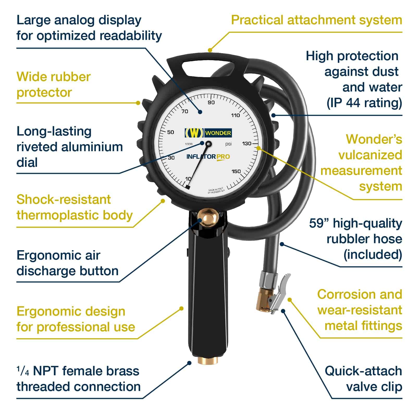 EXTREMELY SOLID AND DURABLE The new Wonder inflator gauge is built to last, thanks to the wide protective rubber crown, the shock-resistant thermoplastic body and the corrosion and wear-resistant metal fittings.