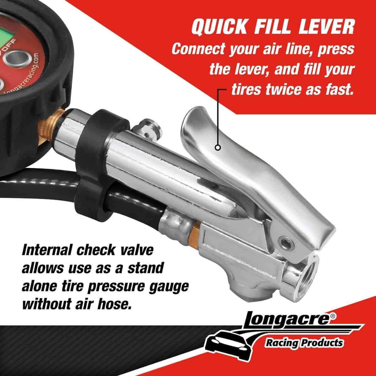 Utilice esta herramienta imprescindible como su medidor de presión de neumáticos regular para una consistencia. Ahora con luces traseras. Conéctese a la línea de aire, llene y purgue con un solo medidor. Incluye estuche plateado para transportar.