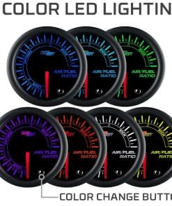 GlowShift Tinted 7 Color Series Narrowband Air/Fuel Ratio Gauge es un medidor que monitorea y muestra la mezcla de aire y combustible del motor leyendo la salida de voltaje de un sensor de oxígeno estrecho. Con lecturas de relación aire/combustible estrecho de mezclas pobres, óptimas y ricas, este medidor de 2-1/16″ (52mm) cuenta con una esfera negra, lente ahumada y aguja iluminada en rojo. Con 7 modos de color sólido y 2 modos de ciclo de colores, puede combinar las luces del tablero de fábrica o agregar un estilo personalizado al interior de su vehículo. Los colores incluyen azul, rojo, verde, teal, morado, blanco y amarillo. Al conectar el cable de atenuación al interruptor de las luces, el brillo del medidor se reduce en un 30% cuando las luces están encendidas. Este medidor incluye un arnés de alimentación de 2′ con cable de sensor de 6′, visera de medidor, hardware de montaje e instrucciones de instalación. Con la garantía GlowShift con una garantía limitada de un año y soporte técnico gratuito de por vida, puede confiar en la calidad y el rendimiento de este medidor de relación aire/combustible estrecho.
