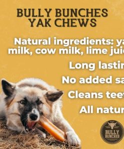 Bully Bunches Mega Authentic Yak Cheese Himalayan Chews for Giant Dogs & Super Aggressive Chewers es la opción perfecta para los dueños de perros que desean darle a sus mascotas una golosina natural y duradera. Estas golosinas para perros están hechas de leche de yak/cabra y jugo de limón, lo que las hace completamente naturales y seguras para que tu perro muerda. Son ideales para perros grandes a XL, ya que pesan más de 190g cada una y son resistentes incluso para los masticadores más agresivos. Además, estas golosinas son libres de piel de buey, lo que las hace más seguras y saludables para tu perro. Producidas en las montañas del Himalaya, estas golosinas para perros son éticamente obtenidas y elaboradas con los mejores ingredientes. Su receta versátil las convierte en la opción perfecta para mantener a tu perro entretenido y alejado de masticar tus muebles. ¡No esperes más para darle a tu perro la golosina que se merece con Bully Bunches Mega Authentic Yak Cheese Himalayan Chews!
