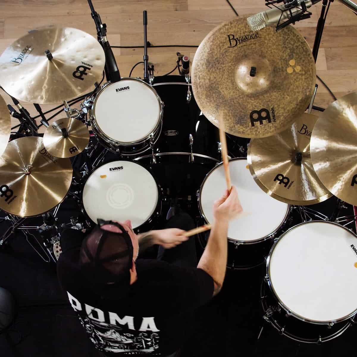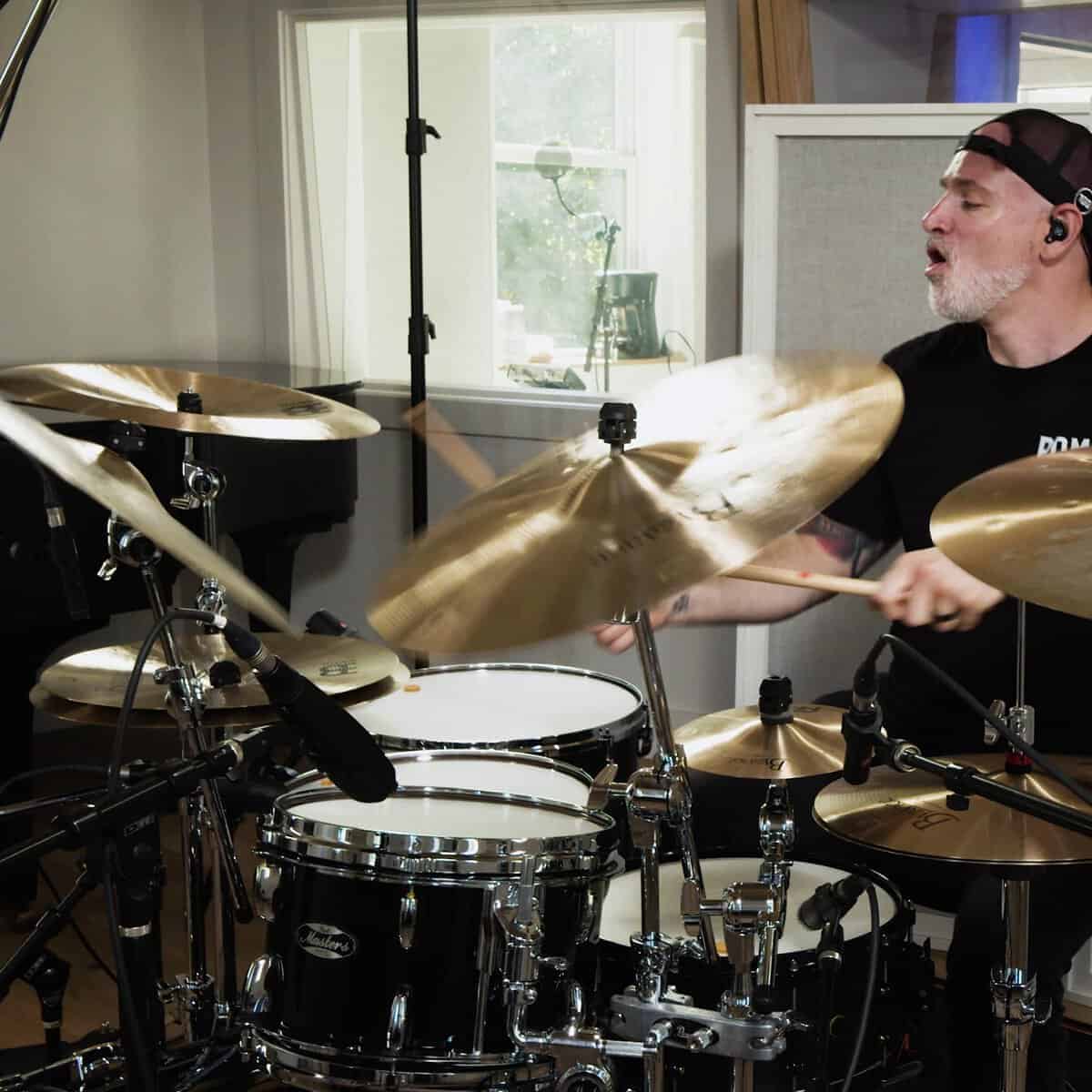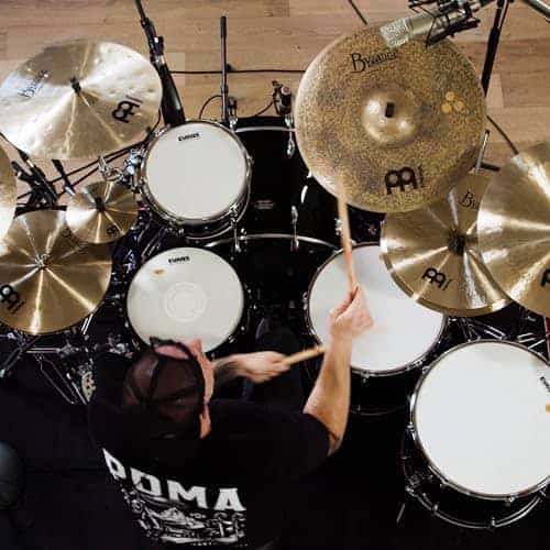 5. DOS FORMAS DE TOCAR: Matt suele tocar con el china en la parte inferior y el crash anidado en el interior (ambos bordes hacia abajo) lo que produce una explosión de sonido corta; también puedes invertir la posición de los platillos y tocar con los bordes hacia arriba para un sonido más sloshier.