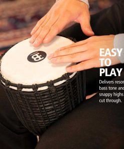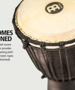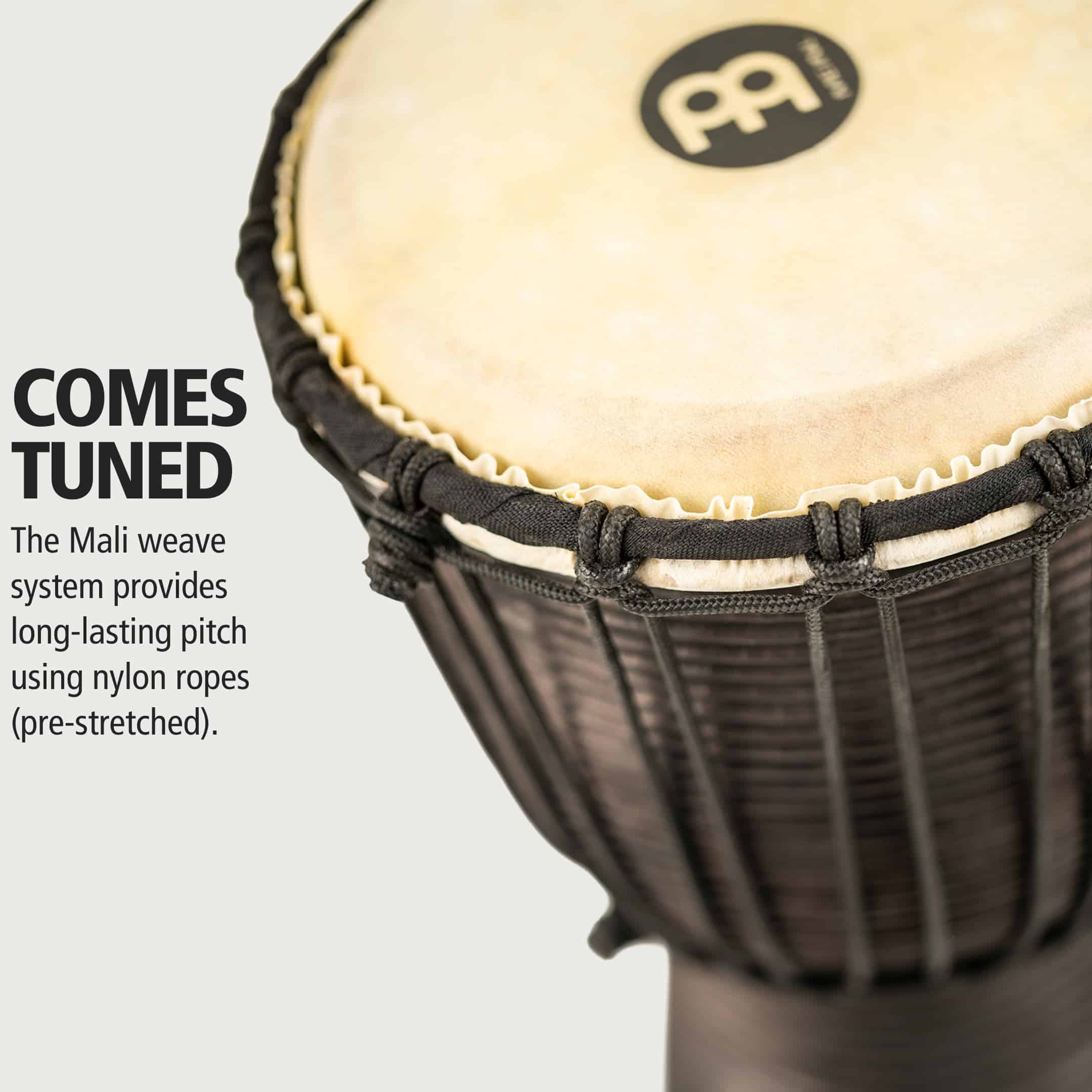 Las carcasas talladas a mano cuentan con un motivo de ondas horizontales que sugiere un río fluido. Esta textura exterior también hace que el djembe sea fácil de sostener entre las rodillas. Las cabezas de cabra seleccionadas a mano están aseguradas y afinadas por el sistema tradicional de tejido Mali-Weave hecho de cuerda de nylon de alta calidad. Los djembes MEINL Headliner tienen propiedades acústicas excepcionales que van desde notas graves resonantes hasta palmadas cortantes y agudas, y están listos para ser recogidos y tocados directamente de la caja. Para una mayor protección de tu instrumento, MEINL se especializa en bolsas de transporte para sus productos de percusión. La bolsa para djembe de MEINL (Modelo MSTDJB) es perfecta para todos los tamaños de djembe y está equipada con costuras de nylon de alta resistencia y una correa para el hombro resistente.