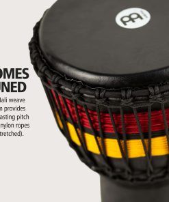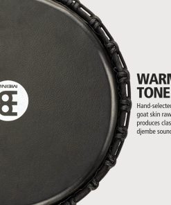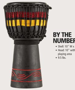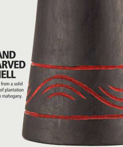 El Djembe Meinl de la serie Fire Rhythm original con ajuste de cuerda africana ropeune no tiene finish negro con diseños tallados a mano. Este instrumento de alta calidad está fabricado con gran atención al detalle y proporciona un sonido excepcional de volumen completo. El Djembe Meinl de estilo africano original con ajuste de cuerda es hecho de un tronco sólido de caoba cultivada en plantaciones. Esta especie de madera tiene la densidad y estabilidad adecuadas para garantizar un Djembe de alta calidad de fuentes sostenibles. Nuestros Djembes están encabezados con piel de cabra seleccionada a mano afeitada (en tono negro sombreado en la serie Fire Rhythm). el sistema de ajuste tradicional Mali-Weave con cuerda pre-estirada htp es una forma fácil y confiable de mantener el Djembe afinado. El Djembe se forma primero en un torno. El cuerpo es luego cuidadosamente moldeado a mano para un borde de apoyo perfecto y contornos interiores adecuados. Estos factores son críticos para las características óptimas del sonido: notas graves profundas, tonos claros completos, y cortes nítidos sin sobretonos no deseados.