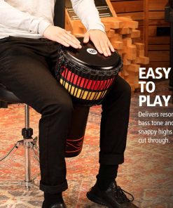 1. APRENDE A TOCAR EN MINUTOS: golpea el centro con toda tu mano para obtener graves profundos y resonantes y cerca del borde con tus dedos para obtener tonos agudos de golpe; este djembe es un instrumento perfecto para ganar confianza tocando percusión sin experiencia. 2. POR QUÉ ES IMPORTANTE: muchas aventuras musicales divertidas no requieren práctica que consuma mucho tiempo en una batería; con el Djembe Estilo Africano de Meinl, puedes tocar en círculos de tambores, shows acústicos con bandas, improvisar con amigos y familiares, o enseñar a estudiantes sobre ritmo. 3. DETALLES: la cáscara está hecha a mano de una sola pieza de caoba maciza de bosques certificados gestionados (NO son piezas de madera pegadas); el exterior está bellamente tallado a mano y se ve genial para la decoración en tu hogar o estudio. 4. IMPULSANDO EL SONIDO: puedes obtener diferentes sonidos de su tradicional cabeza de cuero de cabra cruda pre-ajustada; esta cabeza produce un tono cálido y claro clásico siendo notablemente duradera, y viene lista para tocar directamente desde la caja. 5. A TENER EN CUENTA: el djembe viene afinado y listo para tocar directamente desde la caja; el sistema de ajuste de cuerda West African Mali Weave mantiene un tono duradero, y pre-estiramos las cuerdas para que suene genial de inmediato (viene con instrucciones de afinación). 6. DIFERENCIAS: la cáscara de caoba mide 10″ de ancho x 20″ de alto y pesa alrededor de 9.5 lbs; la cabeza de cuero de cabra mide 10″ con un área de juego de 8″ (la cabeza es ligeramente más grande que el área de juego porque rodea y desciende por el borde). 7. EL VEREDICTO FINAL: esta es tu oportunidad de adquirir un djembe resistente, hecho a mano y versátil que produce fácilmente una amplia gama de sonidos en interiores o exteriores; no es intimidante de tocar incluso si eres un principiante y se ve hermoso en exhibición.