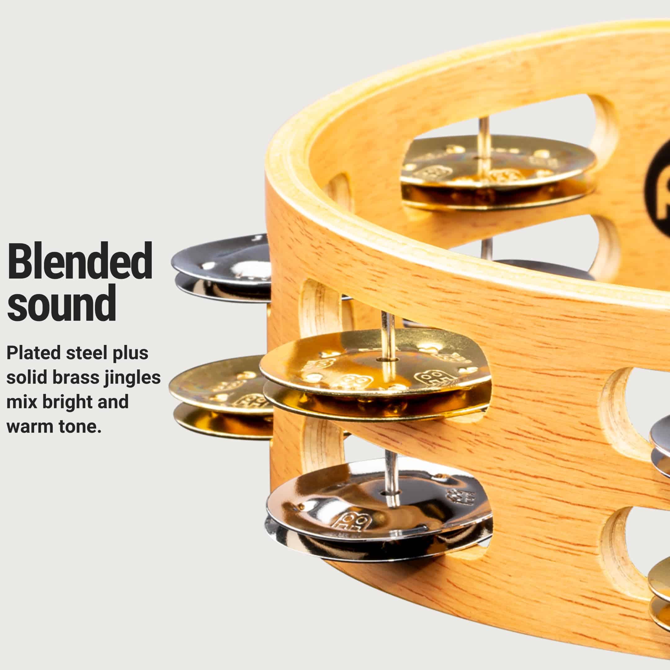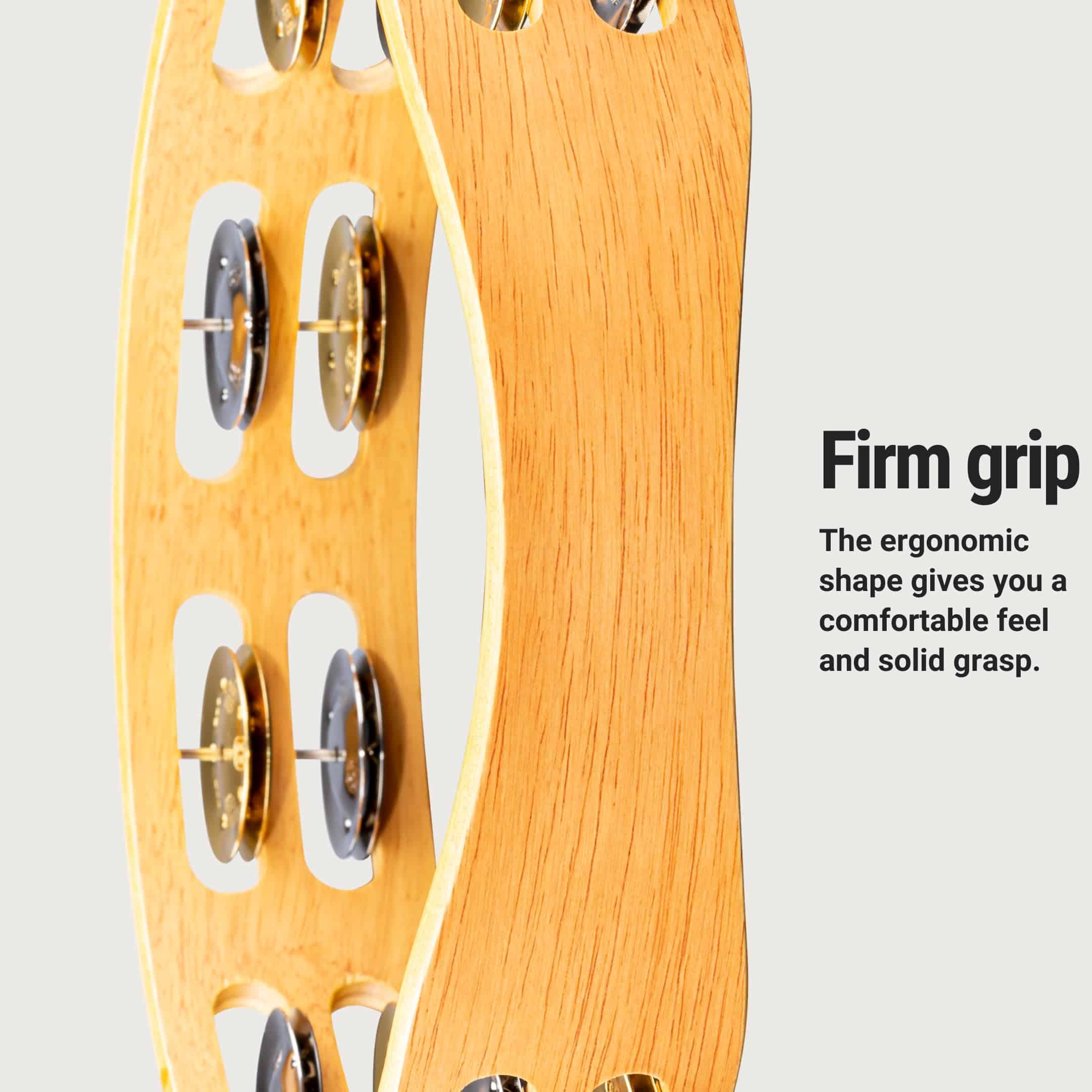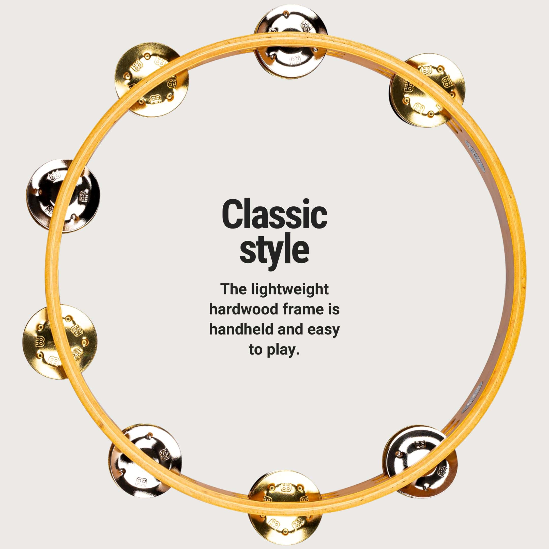Los tamborines de madera tradicionales de la colección MEINL son la elección perfecta para acentos de jingle ultra brillantes y brillantes que responden maravillosamente a cualquier nivel de volumen. El resistente marco de madera ofrece un ataque natural y cálido seguido por los sonidos de corte sensibles de los jingles con un ligero sostenido de alta calidad. Un mango ergonómico te da control total del instrumento. Este modelo está equipado con jingles de aleación dual niquelada de acero sólido/latón que proporcionan claridad y corte definitivos. Su tono es alto, lo que facilita proporcionar una base rítmica fuerte con otros instrumentos a cualquier nivel de volumen. Estos tamborines son ideales para percusionistas y bateristas, pero cualquier músico o vocalista encontrará extremadamente útiles en su ejecución también.