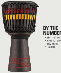 El Meinl Djembe original de la serie Fire Rhythm estilo Africano tiene un acabado negro con diseños tallados a mano. Este instrumento de alta calidad está elaborado con gran atención al detalle y proporciona un sonido excepcional y de volumen completo. El Djembe original style rope tuned de Meinl está hecho de un tronco sólido de caoba cultivada en plantaciones. Esta especie de madera tiene la densidad y estabilidad adecuadas para garantizar un Djembe de alta calidad proveniente de fuentes sostenibles. Nuestros Djembes están encabezados con piel de cabra seleccionada a mano y afeitada (de color negro sombreado en la serie Fire Rhythm). El sistema de ajuste tradicional Mali-Weave con cuerda htp pre-estirada es una forma fácil y confiable de mantener el Djembe afinado. El Djembe se forma primero en un torno. Luego, el cuerpo se moldea cuidadosamente a mano para obtener un borde de cojinete perfecto y contornos interiores adecuados. Estos factores son críticos para obtener características de sonido óptimas: notas graves profundas, tonos claros completos y golpes de corte nítidos, todo sin armónicos no deseados.