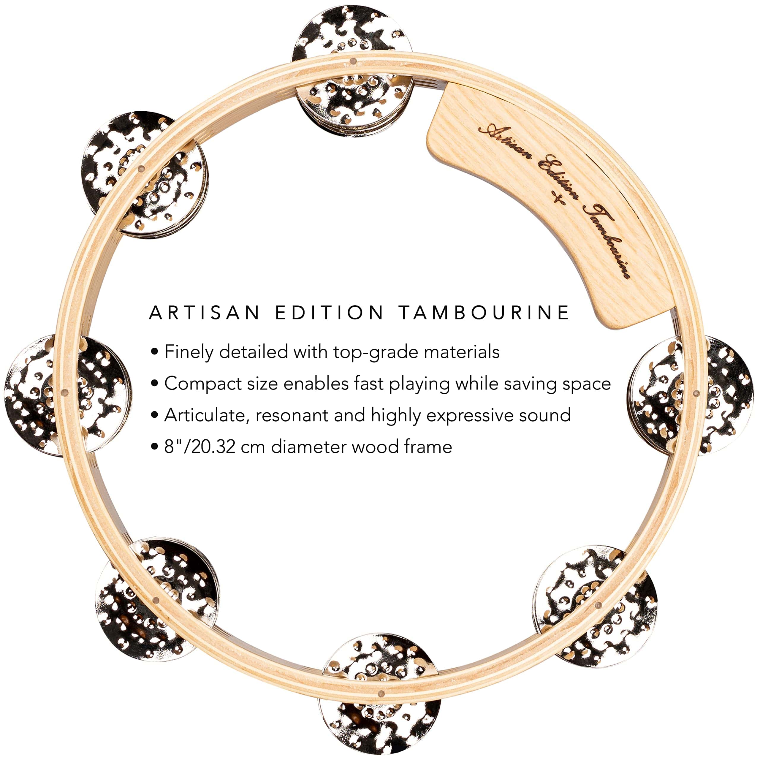 Los populares tambourines Meinl Artisan Edition ahora vienen en una versión compacta. El tamaño de este casco de fresno americano es de 8 pulgadas de diámetro y cuenta con 3 filas de platillos de acero niquelado martillados. Las ranuras estrechas de los platillos asegurarán precisión y precisión cuando lo necesites.