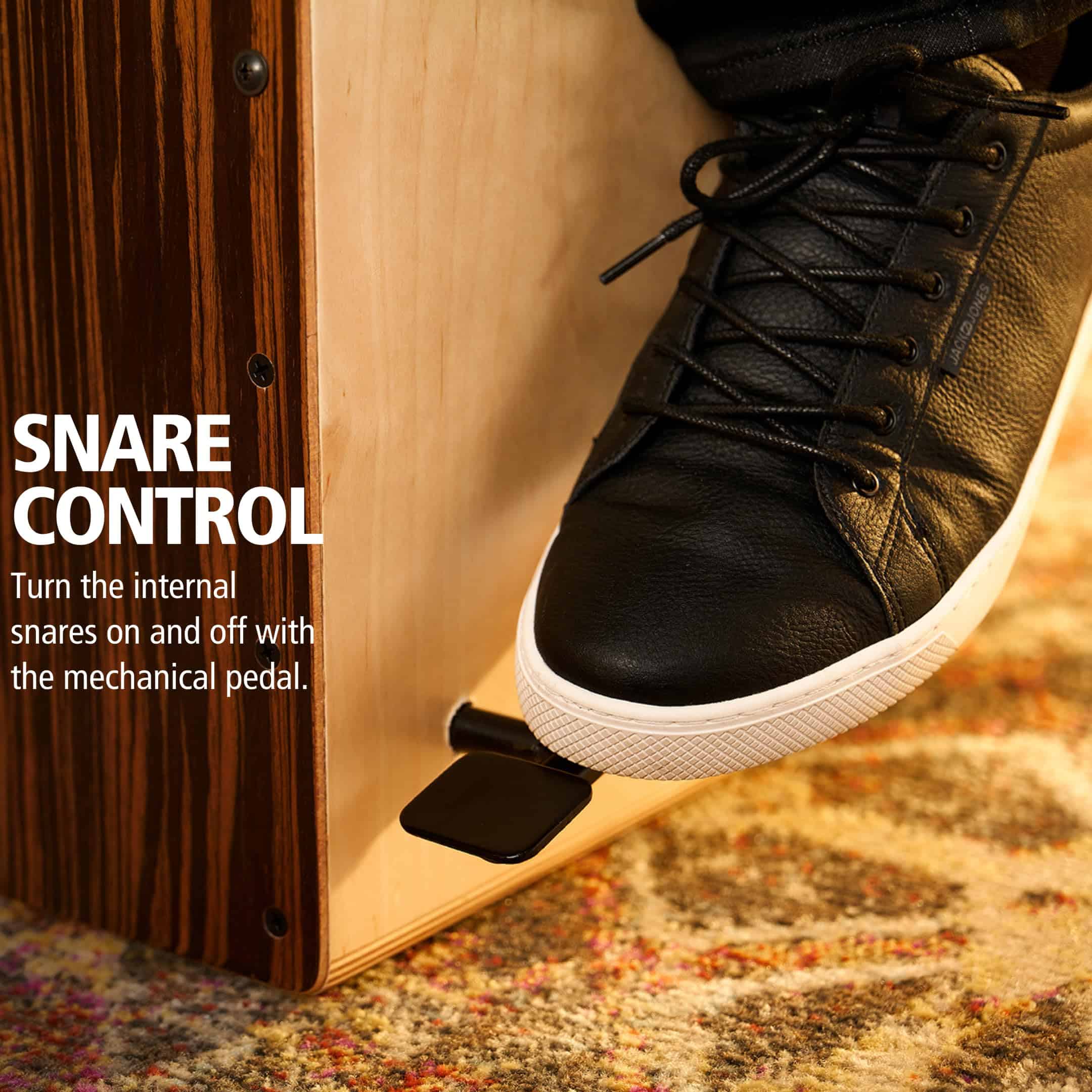 El cajón de bajo de ébano con pedal de sordina cuenta con un disparador de sordina activado por el pie. Al presionar el pedal, los músicos pueden alterar la presión que las sordinas internas ejercen sobre la superficie de juego, y las sordinas pueden apagarse por completo. Ideal para alternar entre estilos de cajón flamenco y peruano. Una placa frontal de ébano tiene sonidos ricos con mucha respuesta. El cuerpo resonante de abedul báltico le da al cajón un ataque enfocado con un amplio rango dinámico de agudos y graves.