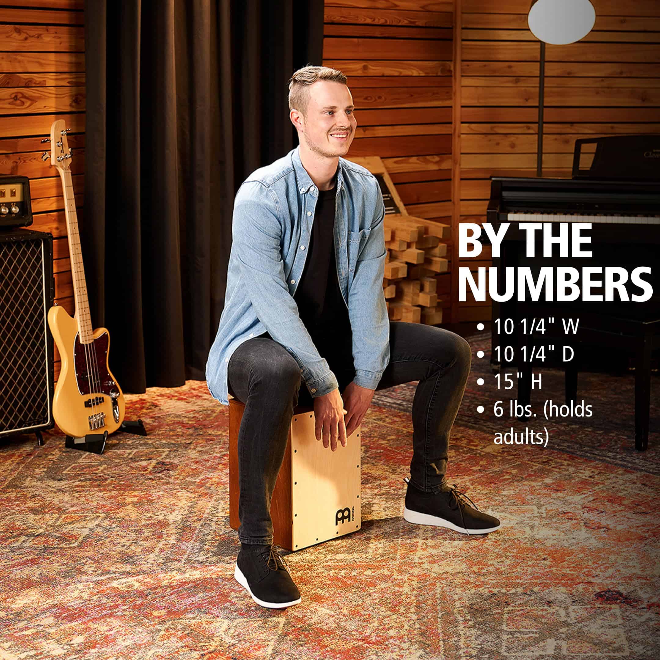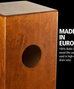 Este cajón es el instrumento de percusión acústica de madera en el que te sientas y tocas con las manos (pronunciado «kah-hone»). A veces se le llama beatbox o caja de percusión. El Meinl Percussion Compact Jam Cajon con trampas se fabrica en Europa con abedul báltico al 100%. El abedul báltico tiene una nota de bajo resonante y un tono cálido. Esta especie de madera también se utiliza en la construcción de conjuntos de baterías de alta gama para músicos serios sobre el sonido. En el interior hay dos juegos de alambres de trampa de acero enrollados colocados contra la superficie de juego. Estos son del mismo tipo de trampas que se encuentran en tambores de trampa y te dan un tono nítido. Un puerto de sonido en la parte trasera ayuda a desarrollar notas graves y es un lugar perfecto para un micrófono. Los pies de silicona antideslizantes permiten que el cuerpo resuene al máximo mientras proporciona estabilidad. Este instrumento es ideal para conciertos acústicos cuando no se puede usar una batería completa, y su tamaño compacto está diseñado para ser fácil de transportar. Medidas 10 1/4″ de ancho x 15″ de alto x 10 1/4″ de profundidad (sostiene adultos). El Jam Cajon está diseñado para un transporte fácil y un uso sencillo para que cualquiera pueda tocarlo independientemente de su nivel de habilidad o edad. No se requiere experiencia musical. Diseñado en Alemania.