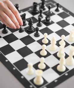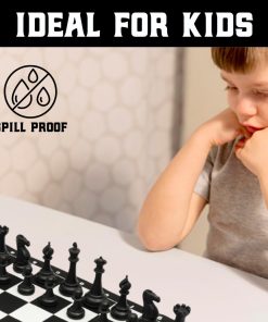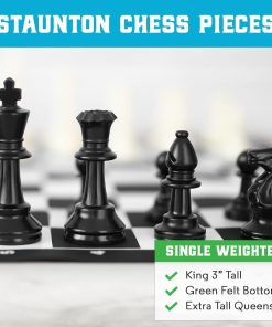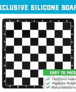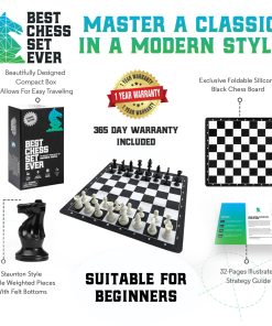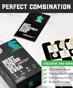 El Mejor Juego de Ajedrez Jamás combina componentes clásicos y materiales modernos para un juego de ajedrez duradero, portátil y elegante. Las piezas de ajedrez de estilo torneo Staunton son grandes, fáciles de manejar y tienen una base pesada y fieltrada que las hace perfectas para jugar en interiores o exteriores. El tablero de silicona se coloca plano y se limpia fácilmente para que no tenga que preocuparse por derrames o arrugas. También incluimos nuestra guía de 32 páginas, La Mejor Guía de Estrategia de Ajedrez Jamás, que presenta instrucciones ilustradas para ayudar a jugadores de todos los niveles de habilidad. Todos los componentes caben perfectamente en la caja de juego incluida para que pueda llevar el Mejor Juego de Ajedrez Jamás a todas partes.