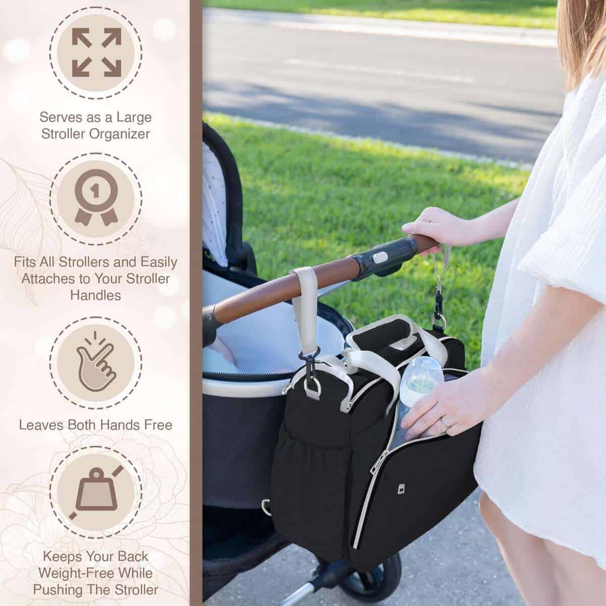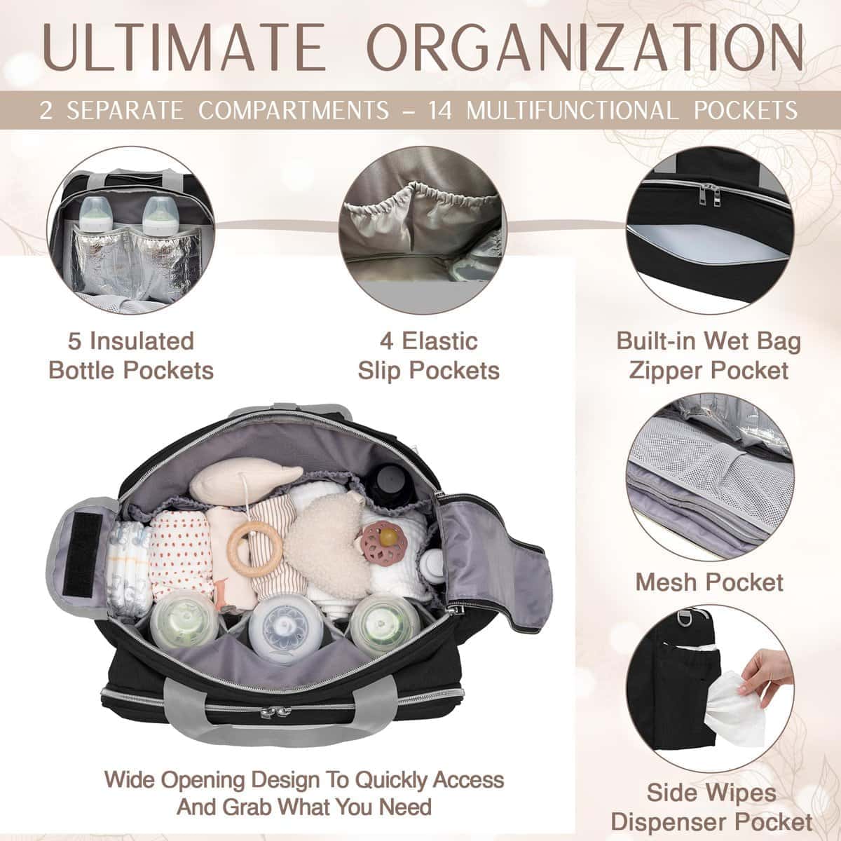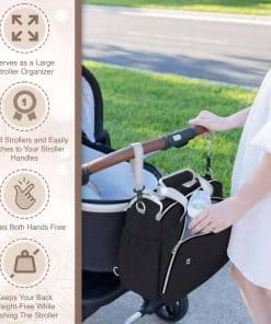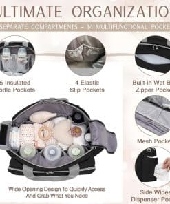 2. Organización sin problemas. Con 2 amplios compartimentos, 9 bolsillos multifuncionales y 5 bolsillos aislados para botellas, este bolso se mantiene organizado y fácilmente accesible incluso cuando está completamente lleno, gracias a su diseño de amplia abertura. Los compartimentos ofrecen amplio espacio para artículos más grandes como toallitas y cambios de ropa, mientras que los bolsillos dedicados mantienen los elementos esenciales del bebé ordenados y accesibles. Los bolsillos aislados para botellas mantienen las temperaturas durante períodos prolongados, ofreciendo máxima comodidad para los padres en movimiento.