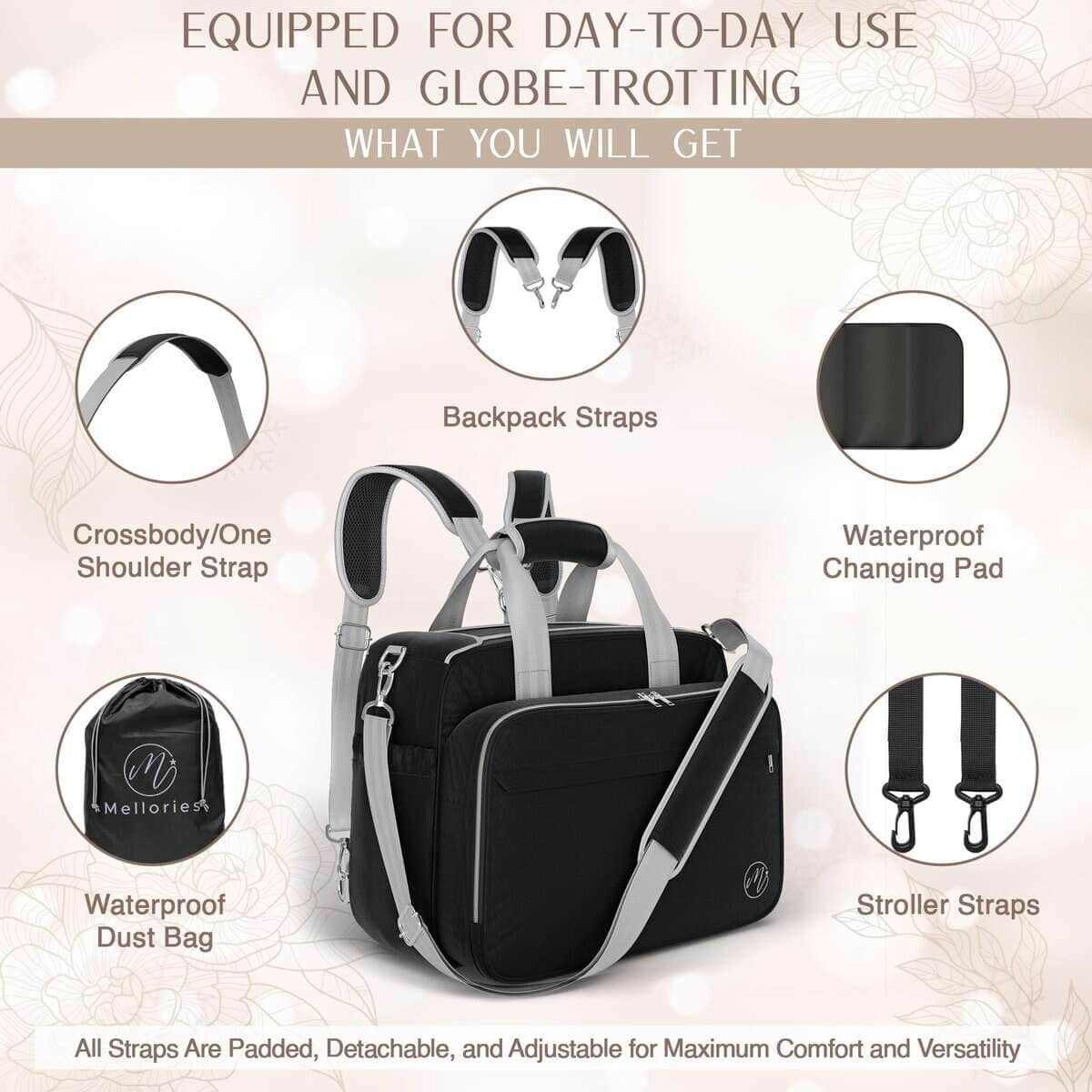 1. Disfruta de la comodidad de varias bolsas en una. Diseñado para simplificar tu viaje como padre, el bolso de pañales para bebés de Mellories cuenta con un diseño versátil que se convierte fácilmente en cinco estilos: crossbody, de un hombro, mochila, bolso de mano y bolso para carrito. Las correas de la mochila se pueden quitar al usarse como bolso de mano, y las correas para el carrito se ajustan fácilmente para adaptarse a varios modelos de carritos. Cada estilo se adapta a diferentes necesidades y actividades, fusionándose perfectamente con el estilo de vida y los estilos de transporte de cualquier padre.