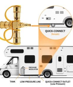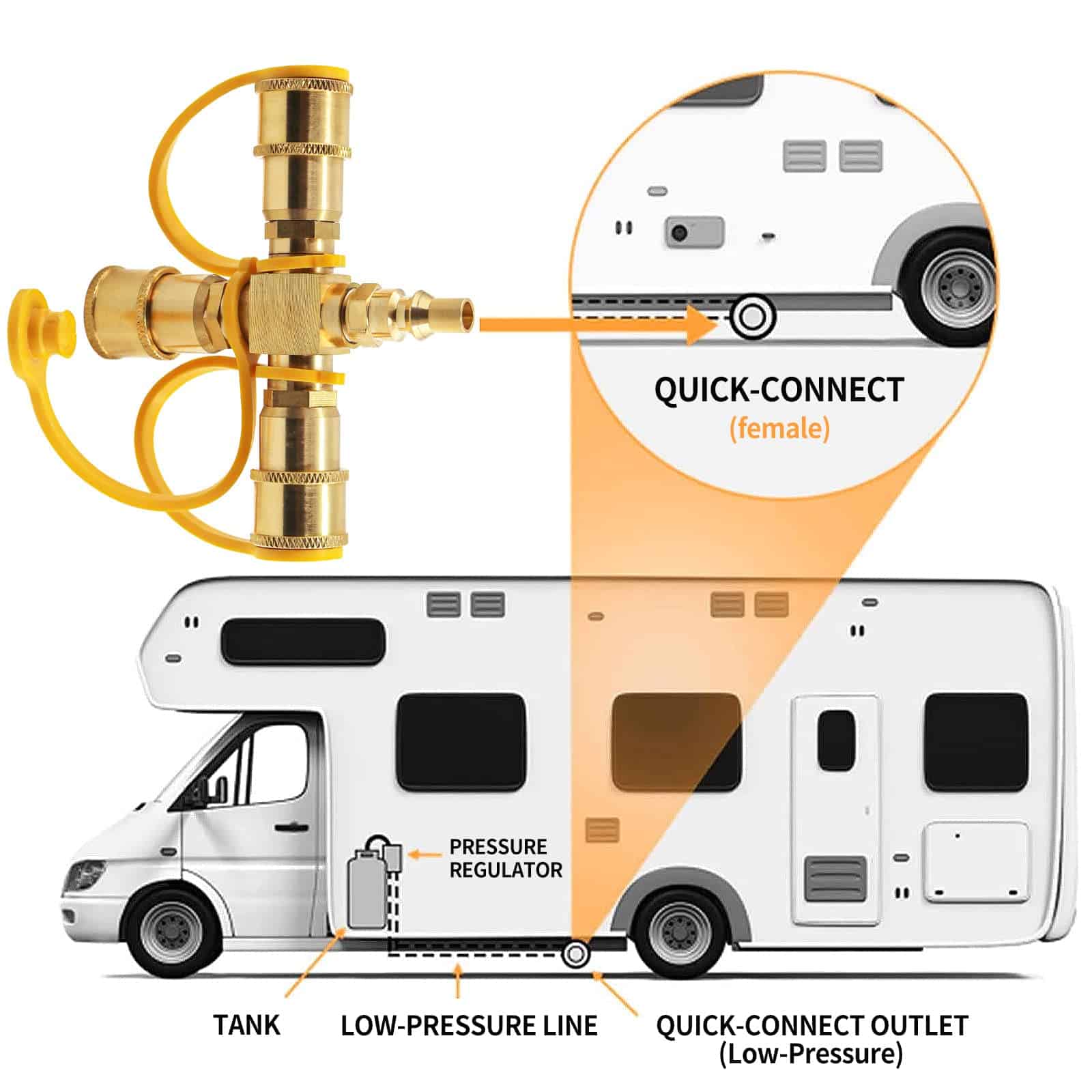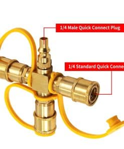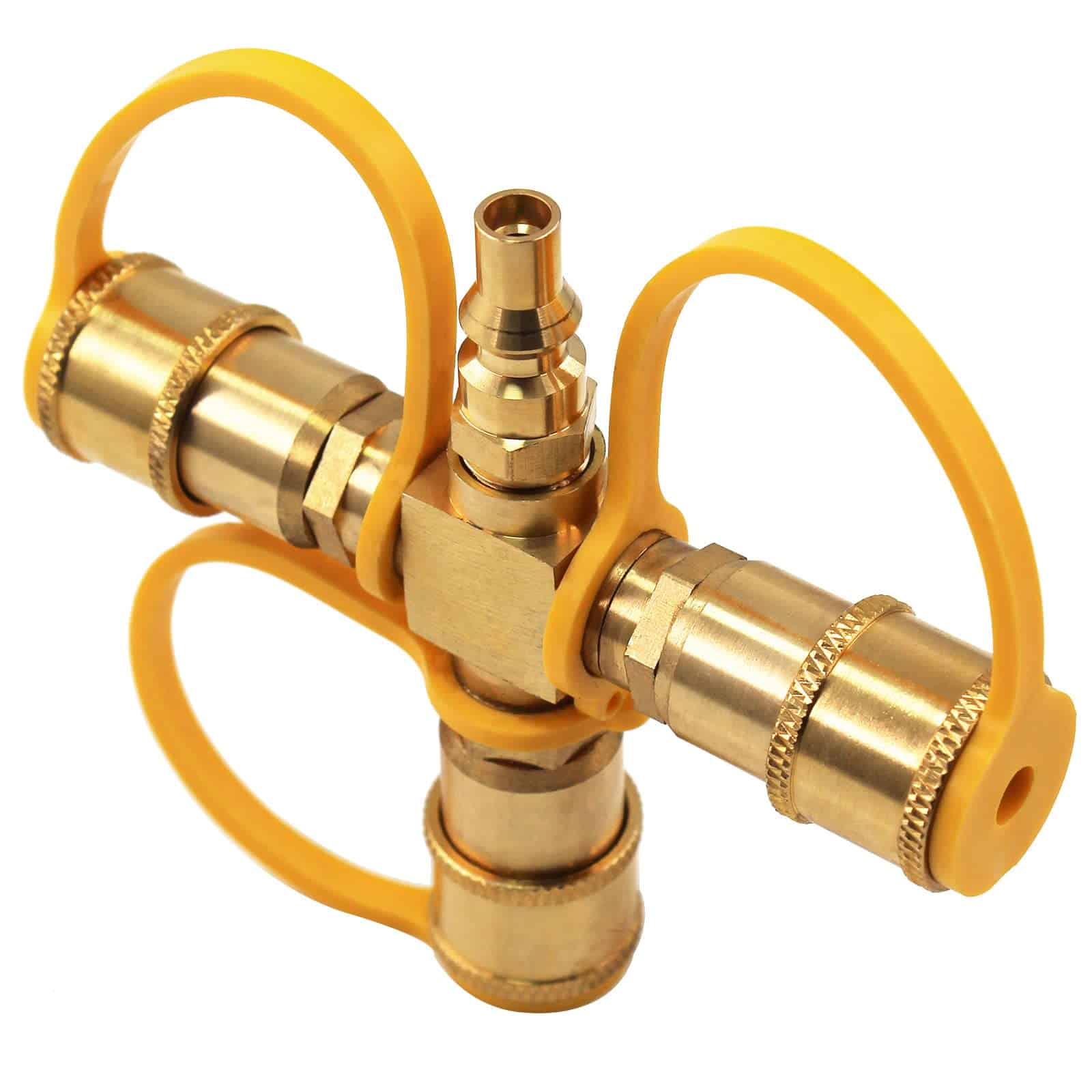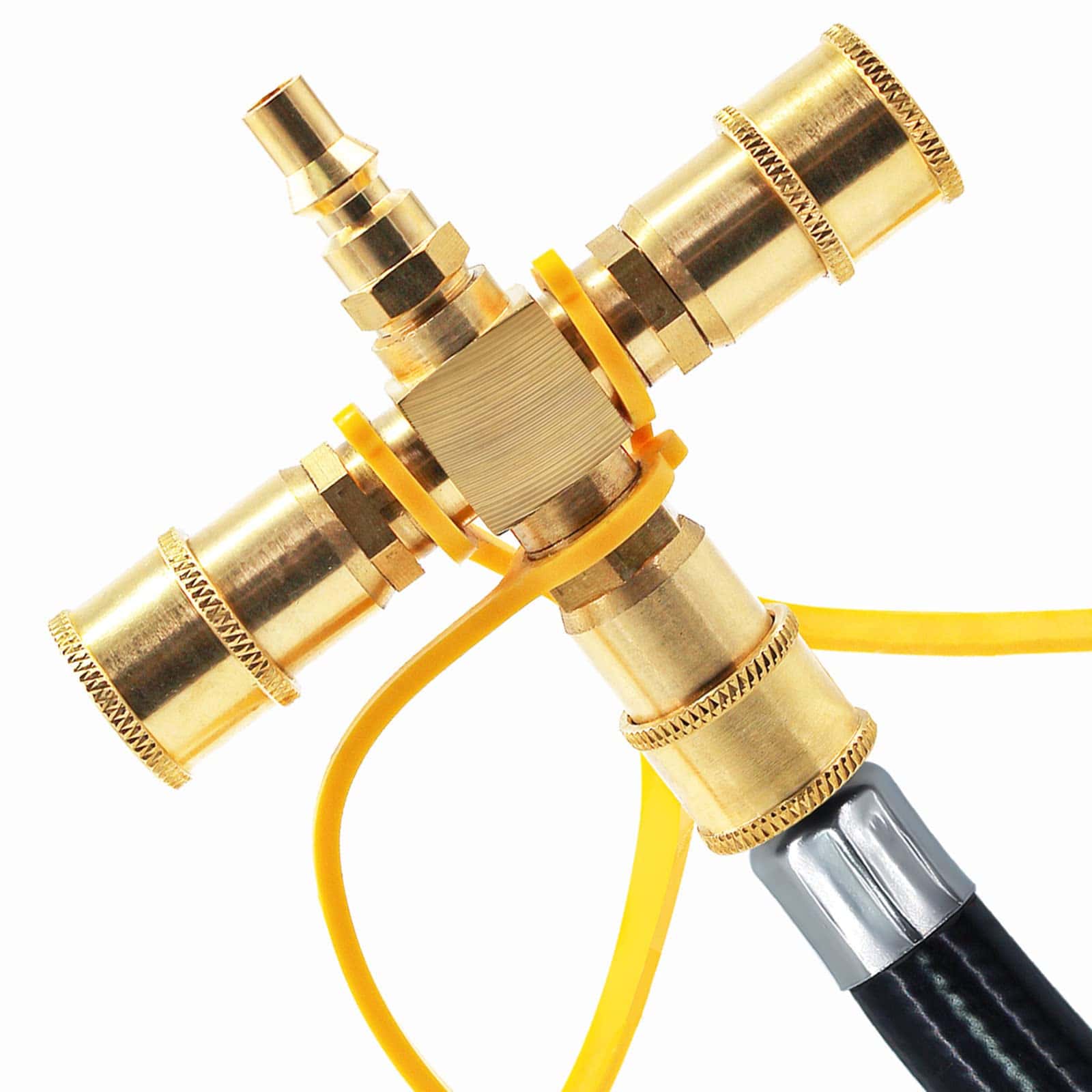 Conecte el enchufe de 1/4″ en su conexión rápida actual y conecte nuestra conexión de liberación rápida en tres mangueras de 1/4″ fácilmente