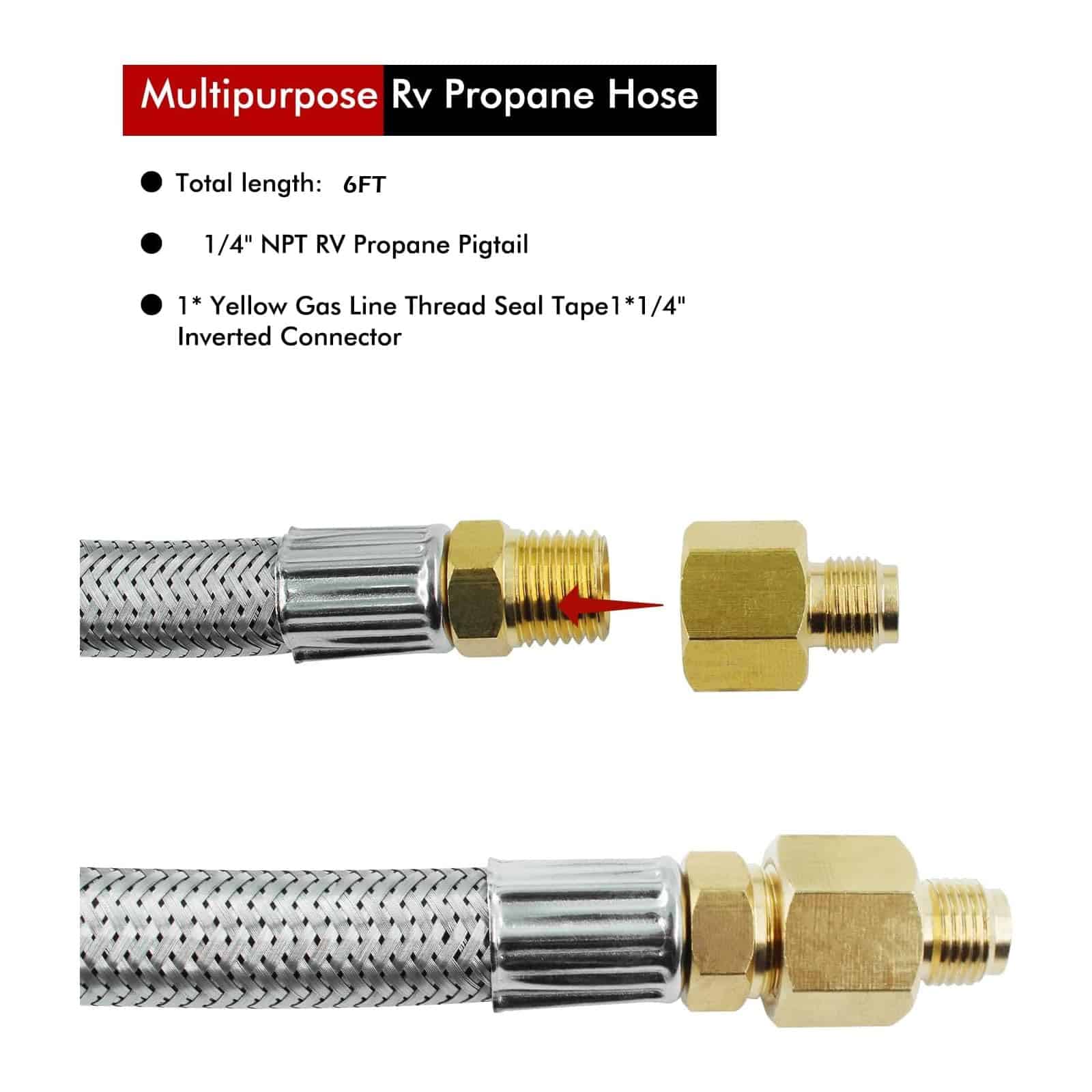 Con una longitud de 6 pies, esta manguera de extensión es ideal para su uso con calentadores de cabaña, hogueras, estufas de propano y más. Su construcción duradera con manguera trenzada de acero inoxidable 304 la hace resistente y evita daños.
