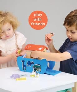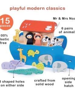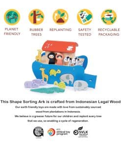 Presentamos nuestra Arca de Animales de Clasificación de Formas, un cautivador juego de madera que lleva a los niños en una emocionante aventura de clasificación de formas. Este juguete encantador incluye un barco, el Sr. y la Sra. Noah, y una variedad de animales para jugar de forma interactiva. Mejora el reconocimiento de formas y las habilidades motoras finas a medida que los niños emparejan los animales con sus formas correspondientes en la quilla del barco, creando una experiencia de juego divertida y educativa. El set incluye 2 rinocerontes, 2 jirafas, 2 cebras, 2 cocodrilos, 2 tortugas y 2 elefantes, proporcionando una variedad de animales para inspirar narrativas imaginativas. Agregando un toque caprichoso a la experiencia de juego, los paneles del techo del barco están adornados con un diseño de arcoíris y nubes de lluvia. Este set cautivador combina la clasificación de formas y el juego de animales, fomentando el desarrollo cognitivo y alentando la narración imaginativa en los niños. Navega en el Arca de Animales de Clasificación de Formas, donde el descubrimiento, la creatividad y el aprendizaje se unen en un encantador juguete de madera que promete un juego estimulante y aventuras interminables. En Mentari, todos los juguetes están hechos a mano en Indonesia de acuerdo con criterios ecológicos de manera ambientalmente amigable. Nos comprometemos a promover la sostenibilidad, inspirar la creatividad y fomentar el juego consciente. A través de nuestros hermosos y asequibles juguetes de madera, nos esforzamos por fomentar el amor por la naturaleza, la artesanía y el consumo responsable en los niños, capacitándolos para convertirse en guardianes del medio ambiente.