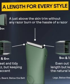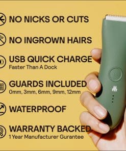 MERIDIAN The Trimmer Original es la cortadora de vello corporal definitiva para hombres. Esta maquinilla eléctrica versátil y práctica está diseñada para recortar con precisión el vello en áreas como el vello púbico, pecho, piernas y bikini. Con su cuchilla de cerámica, esta cortadora evita irritaciones, enrojecimientos y cortes no deseados, proporcionando una experiencia de recorte suave y sin problemas.