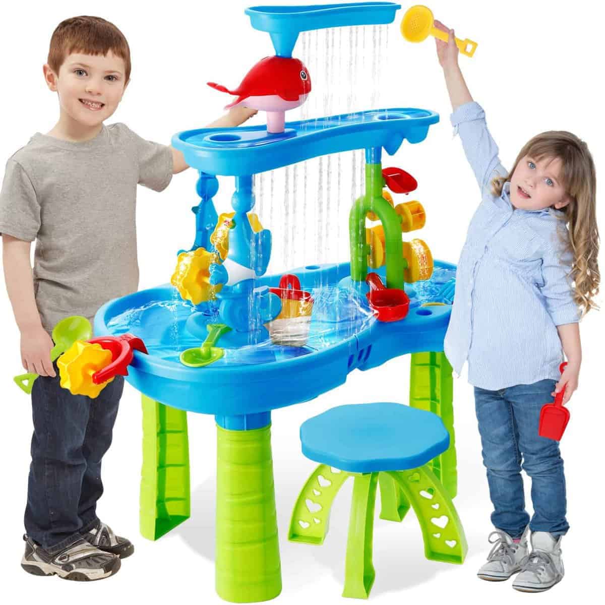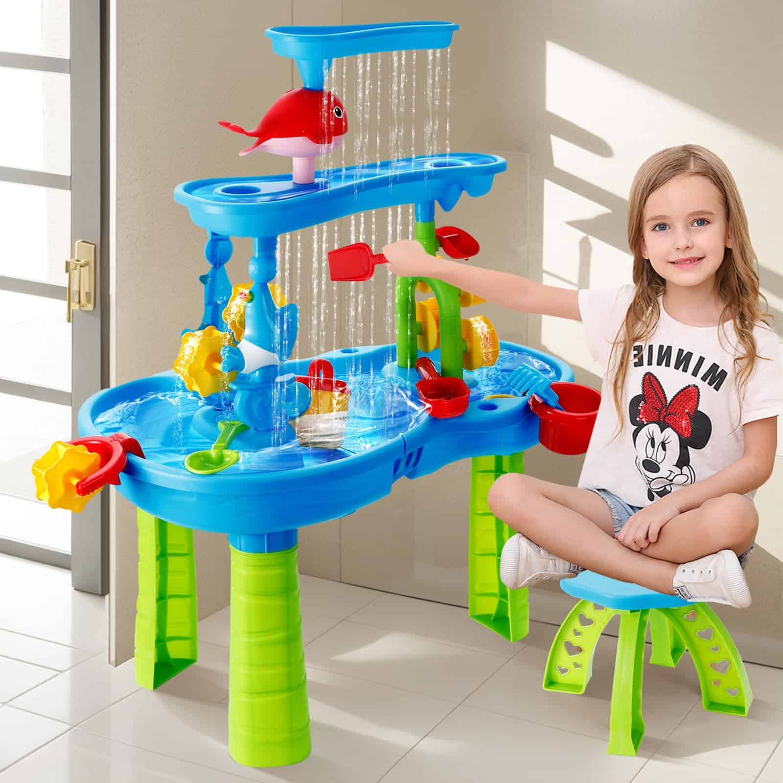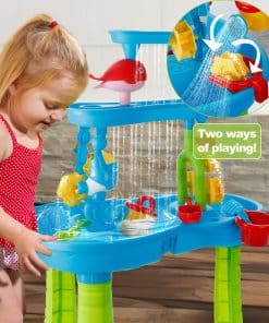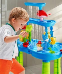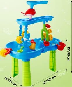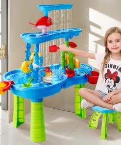 Esta mesa de agua para niños de 1-3 años ofrece una experiencia de juego divertida y educativa al aire libre. Con una altura de 16.5 pulgadas, sus tres bandejas de diferentes niveles permiten a los niños verter agua en la bandeja superior para crear una cascada que alimenta la rueda de agua debajo. Con la posibilidad de jugar con agua, arena o frijoles, esta mesa de agua ofrece una exploración sensorial infinita. El set incluye una variedad de accesorios como un taburete, embudo de delfín, balancín, molino de agua, regadera, tamices, palas, moldes de arena y más, ofreciendo un juego completo y creativo. Los niños pueden trabajar en equipo con los padres para armar la mesa de agua, cultivando habilidades prácticas y de colaboración mientras exploran y experimentan con diferentes materiales. Esta mesa de agua es perfecta para juegos al aire libre, ya sea en el patio trasero, baño o junto a la piscina. Proporciona una diversión interactiva y educativa que fomenta la creatividad, la coordinación mano-ojo y el juego en grupo. ¡Agrega esta mesa de agua a la colección de juguetes de tus hijos y disfruta de horas de entretenimiento al aire libre!