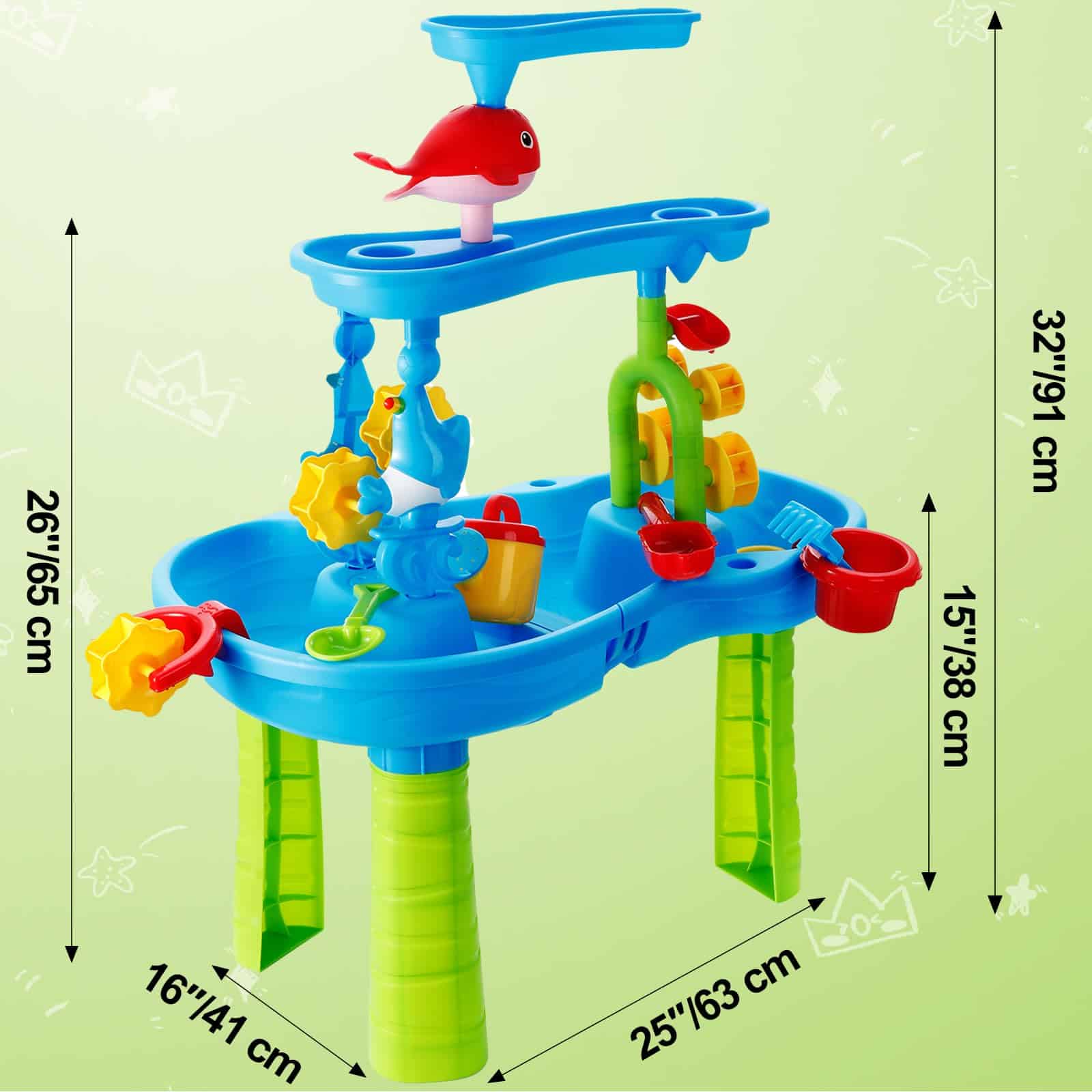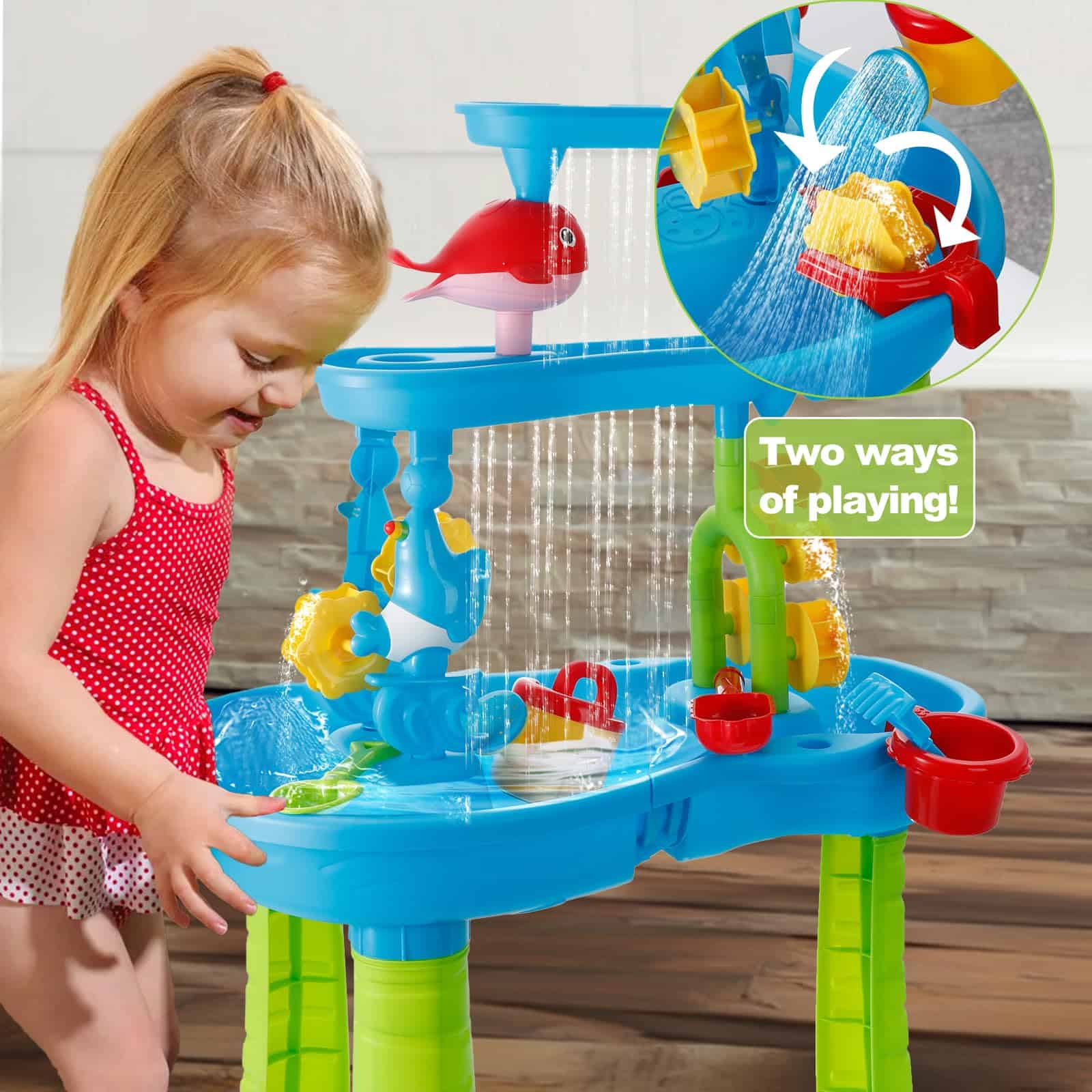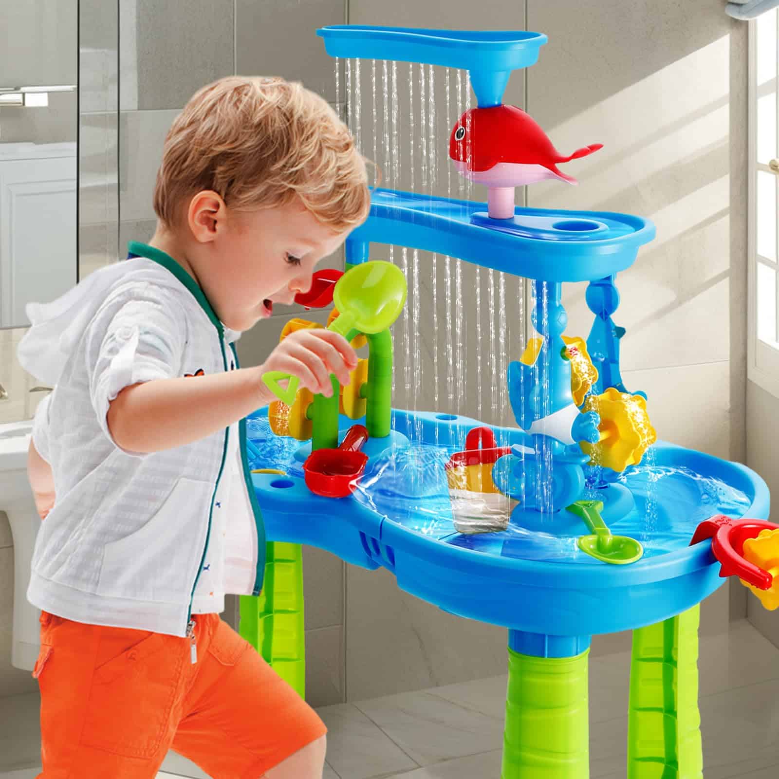 Esta mesa de agua para niños de 1-3 años ofrece una experiencia de juego divertida y educativa al aire libre. Con una altura de 16.5 pulgadas, sus tres bandejas de diferentes niveles permiten a los niños verter agua en la bandeja superior para crear una cascada que alimenta la rueda de agua debajo. Con la posibilidad de jugar con agua, arena o frijoles, esta mesa de agua ofrece una exploración sensorial infinita. El set incluye una variedad de accesorios como un taburete, embudo de delfín, balancín, molino de agua, regadera, tamices, palas, moldes de arena y más, ofreciendo un juego completo y creativo. Los niños pueden trabajar en equipo con los padres para armar la mesa de agua, cultivando habilidades prácticas y de colaboración mientras exploran y experimentan con diferentes materiales. Esta mesa de agua es perfecta para juegos al aire libre, ya sea en el patio trasero, baño o junto a la piscina. Proporciona una diversión interactiva y educativa que fomenta la creatividad, la coordinación mano-ojo y el juego en grupo. ¡Agrega esta mesa de agua a la colección de juguetes de tus hijos y disfruta de horas de entretenimiento al aire libre!