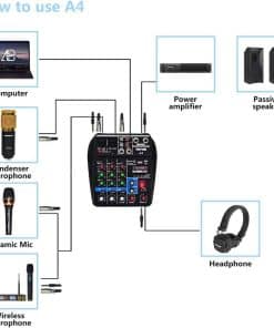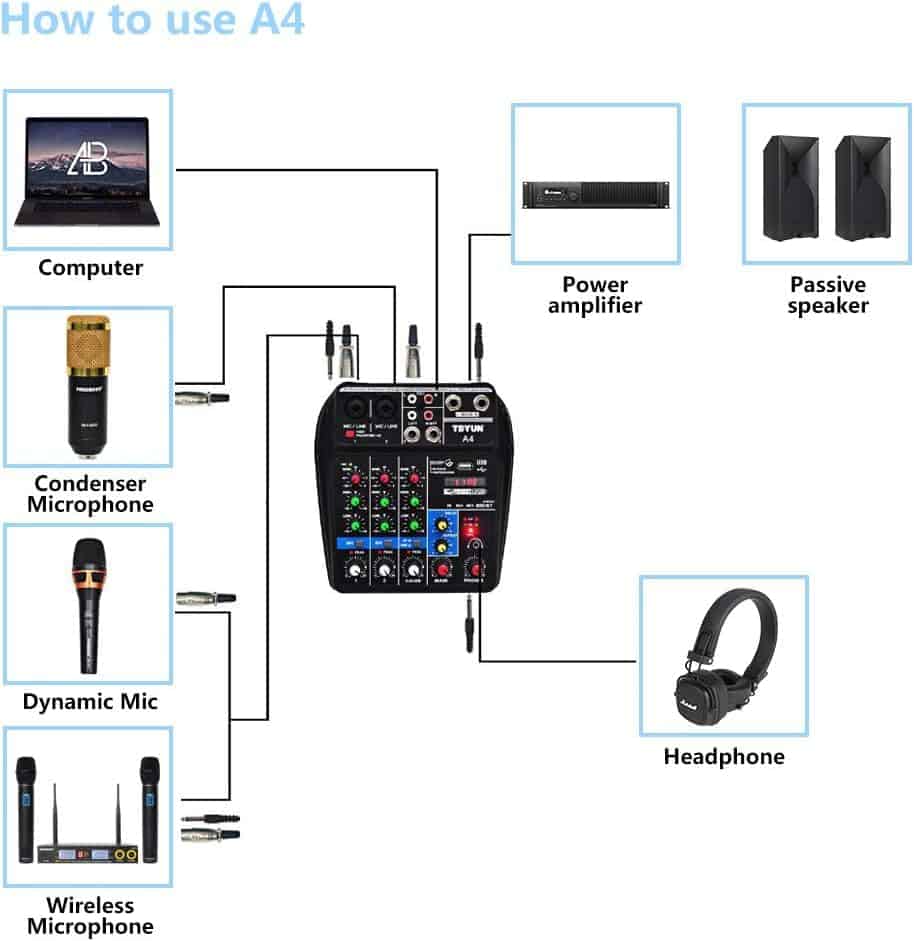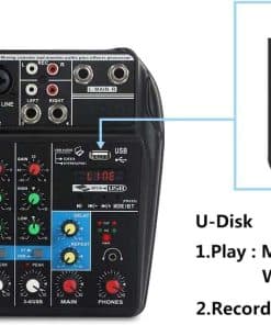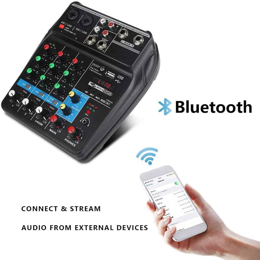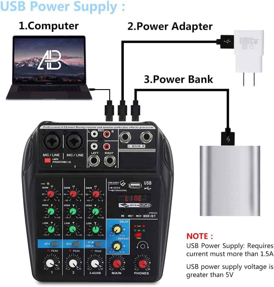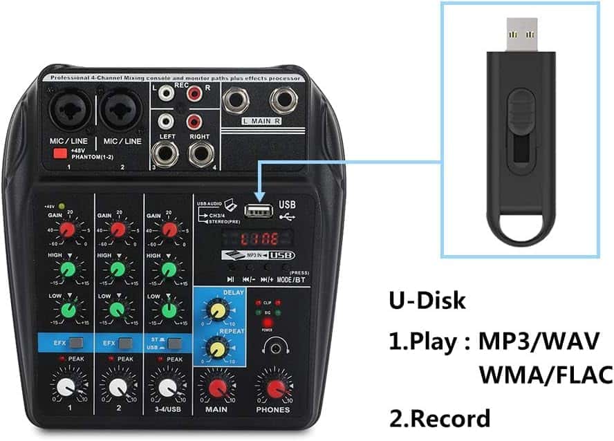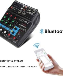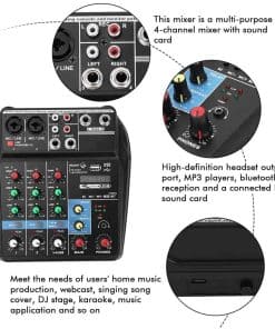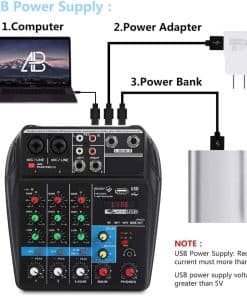 Mesa de mezclas portátil de diseño compacto y tamaño reducido, ligera y alimentación de baja tensión de 5V, puede ser alimentada por computadora / banco de energía de 5V / USB / adaptador DC, muy conveniente de usar. Funcionalidad multifuncional con control de ganancia de entrada, ajuste de sonido alto y bajo. La alimentación phantom de 48V integrada es adecuada para alimentar directamente el micrófono de condensador. Puerto de salida de auriculares de alta definición, reproductor MP3, con tarjeta de sonido, puede conectarse directamente a la computadora. Diseño compacto que se adapta perfectamente encima de tu teclado. Botones prácticos fáciles de ajustar y controlar lo que deseas mezclar de audio. Función Bluetooth: Esta mesa de mezclas con interfaz USB es compatible con Bluetooth y funciona con smartphone, tableta, computadora portátil, PC con emparejamiento sencillo y sin complicaciones. Transmite música de forma inalámbrica como Pandora / Spotify desde tu dispositivo directamente a tu mezcla.