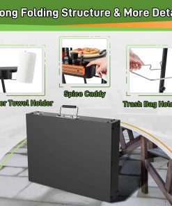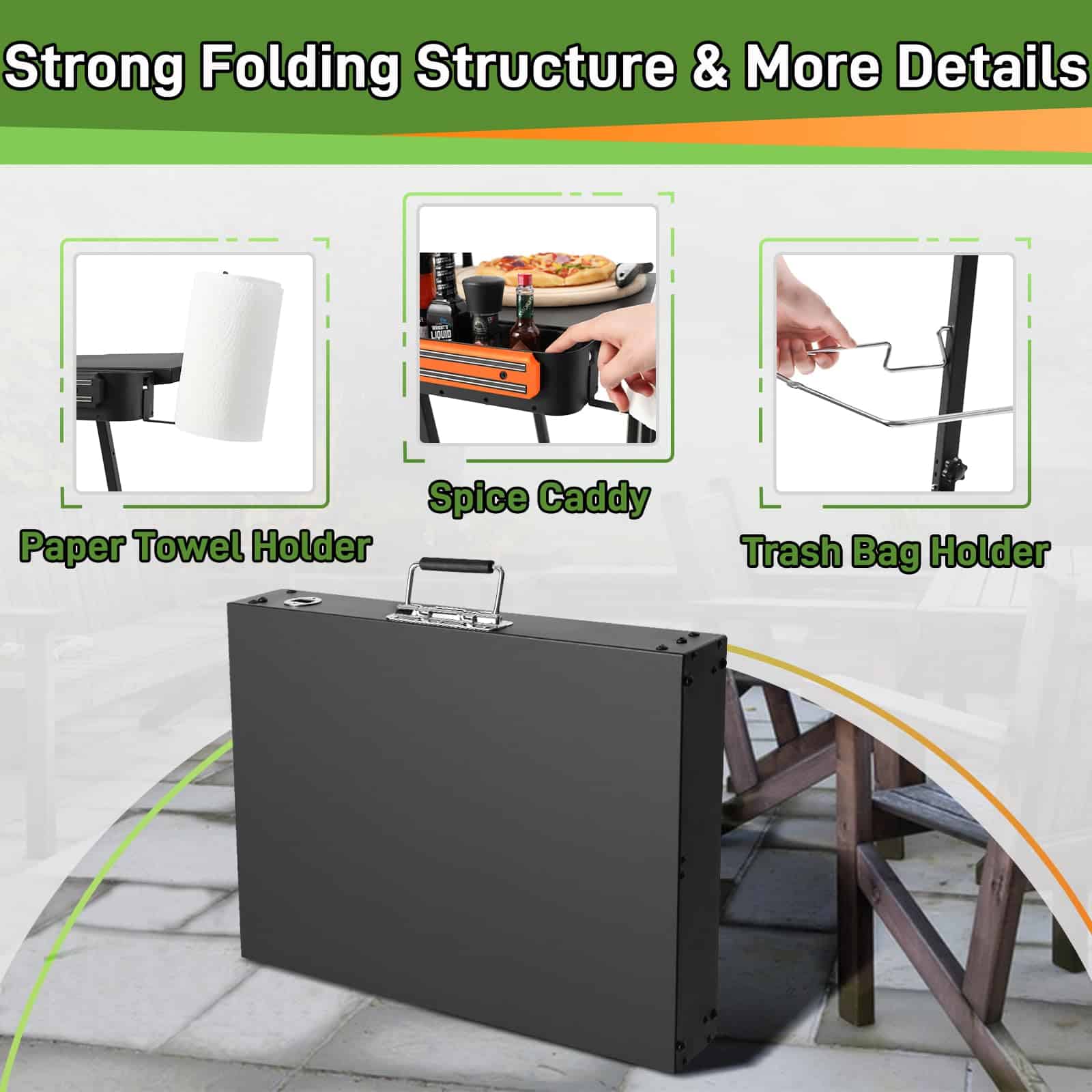 1. Mesa plegable resistente: Esta mesa de barbacoa es una gran adición a tu almacenamiento al aire libre. Hecha de material de metal resistente y de alta calidad, la mesa metálica al aire libre es duradera y más segura con un centro de gravedad estable. Es como un compañero cercano para los entusiastas de la barbacoa en exteriores. Con delicadas asas, esta mesa plegable se ajusta perfectamente a todos los accesorios, solo necesita aflojar ligeramente la tuerca.