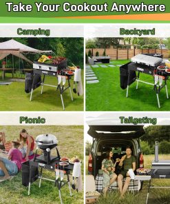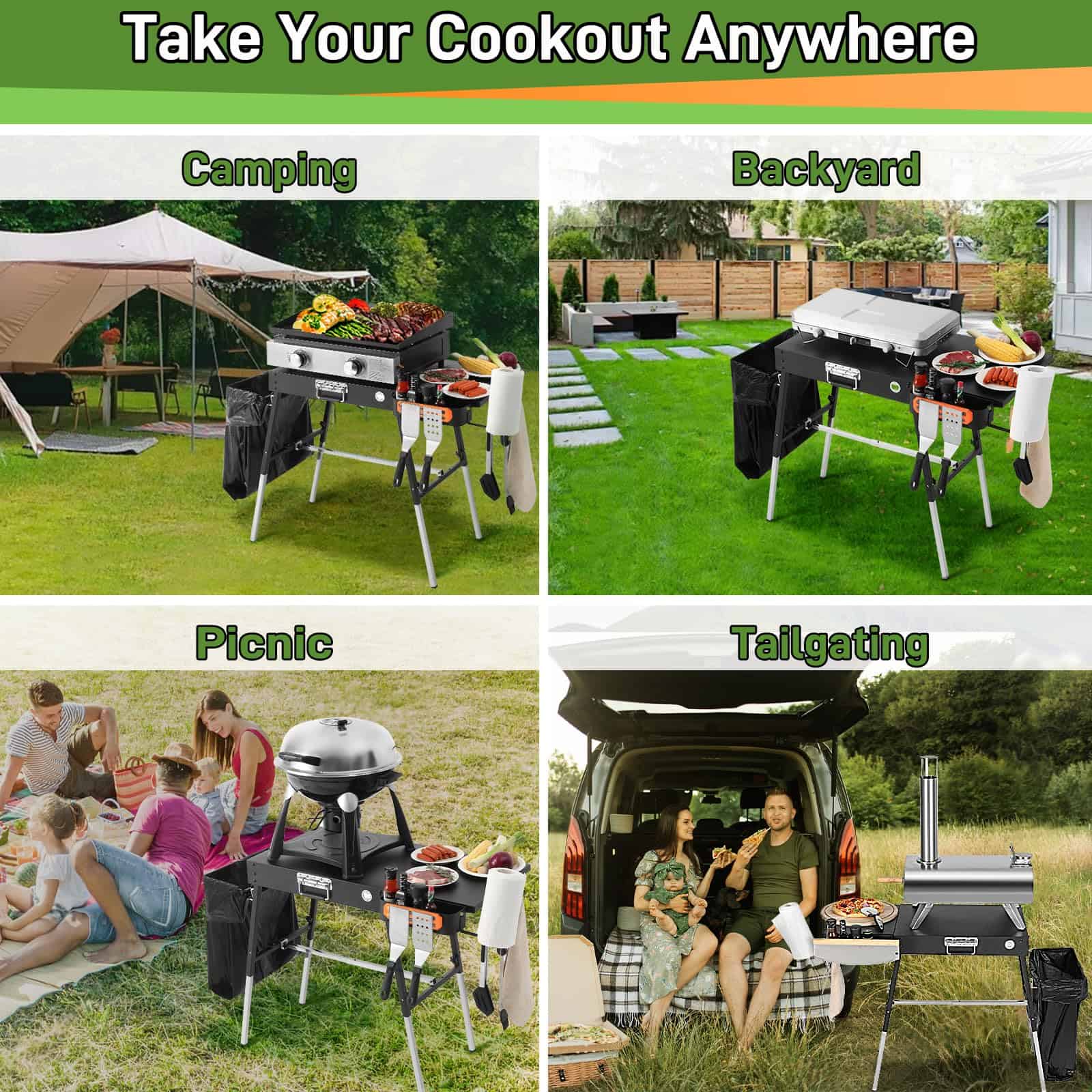 4. Gran Adaptabilidad: Esta mesa de parrilla portátil puede ser utilizada como soporte de parrilla Blackstone, es una excelente propietaria de parrillas Blackstone de 22 pulgadas y parrillas Blackstone de 17 pulgadas, también es igualmente adecuada para parrillas Ninja, parrillas de freidora de aire Ninja, hornos para pizzas, parrillas de mesa Weber, parrillas eléctricas, parrillas de leña, y otras parrillas de mesa.