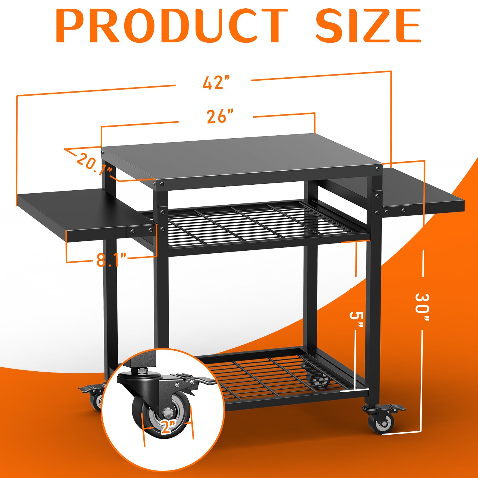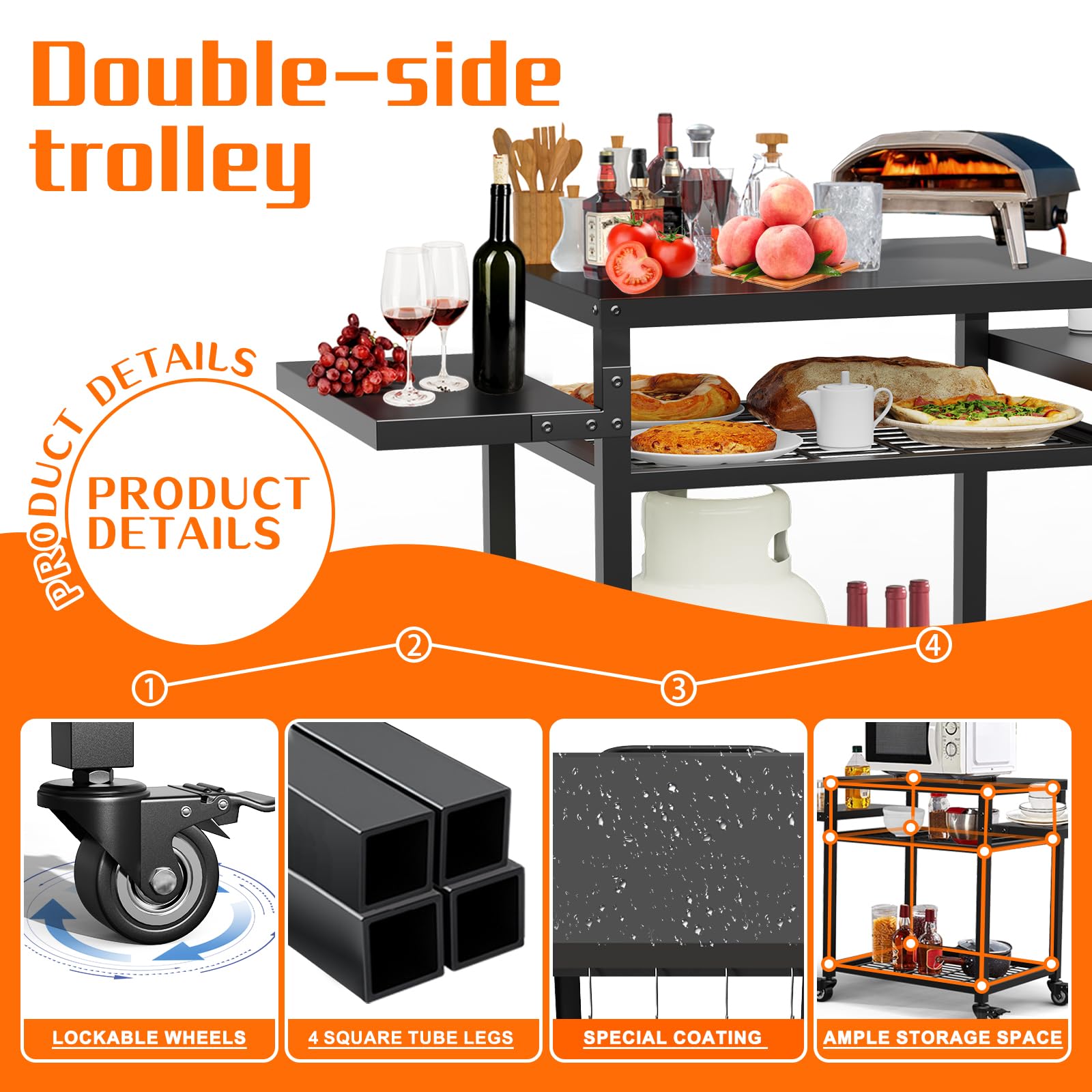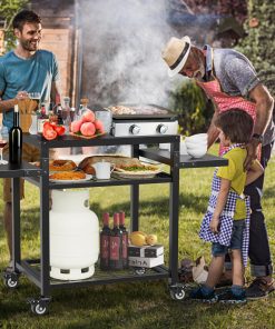 3. Diseño versátil y multiusos: Ya sea utilizado como carrito de horno de pizza, mesa de preparación de alimentos, soporte para plancha Blackstone o isla de cocina al aire libre, este carro de parrilla se adapta a sus necesidades. Ya sea una reunión familiar, cocina al aire libre, fiesta en la piscina, puede manejarlo con facilidad.