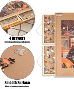2. Diseño Único de Cajones – Nuestra mesa de rompecabezas de madera viene con 4 cajones deslizantes que pueden servir como bandejas de clasificación según colores o formas de las piezas del rompecabezas. Cada cajón tiene un imán incorporado para fijar y prevenir caídas accidentales.