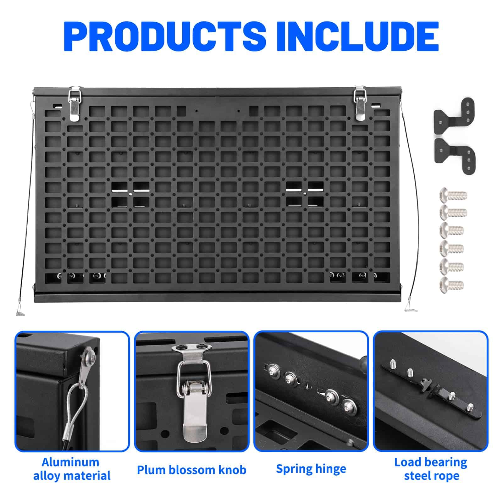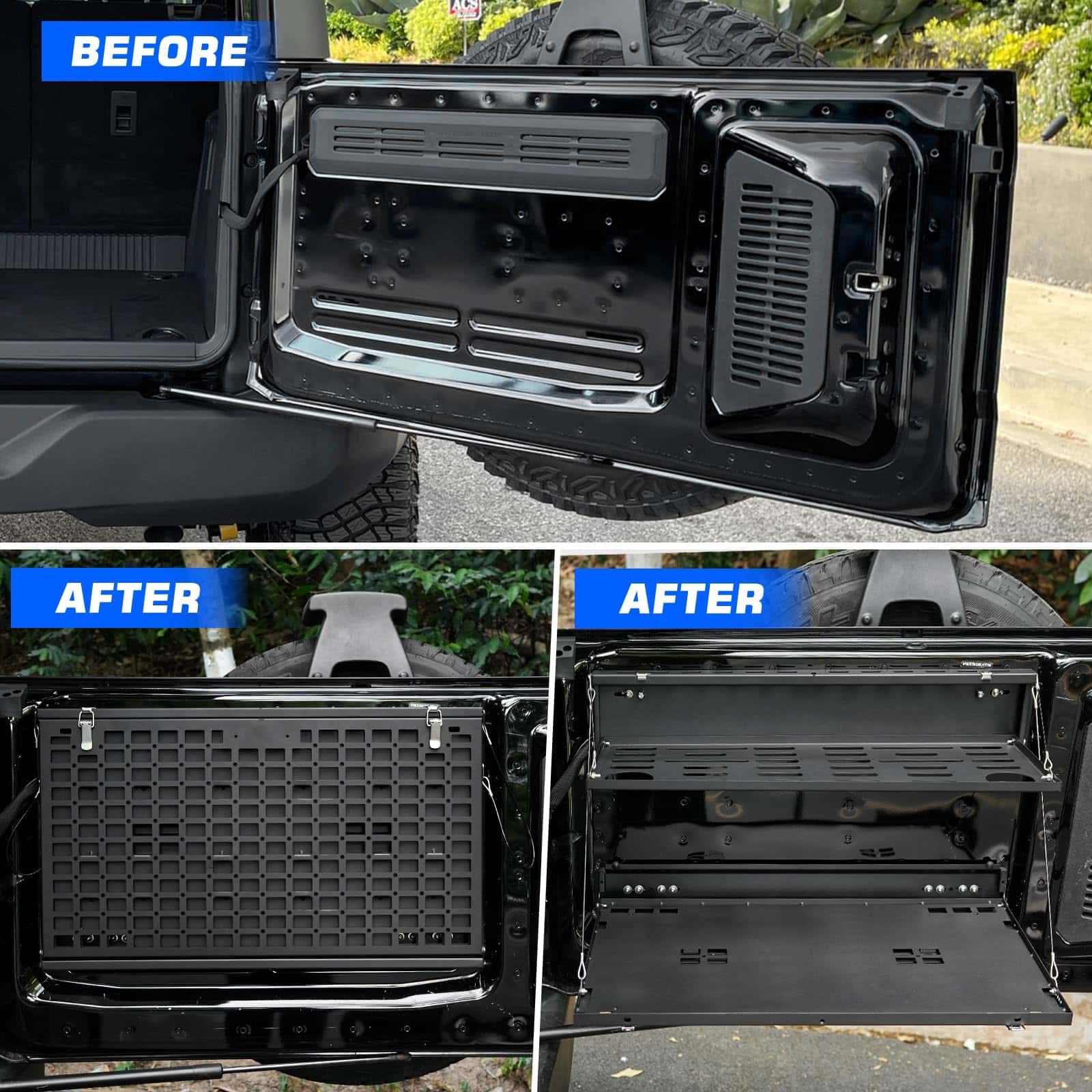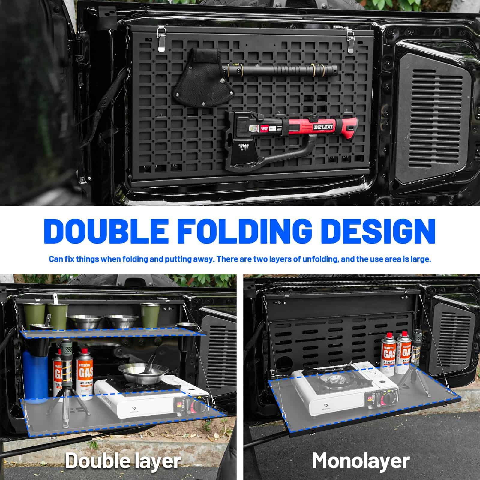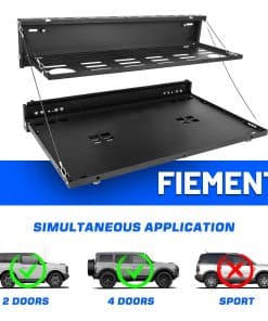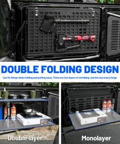 Mesa para puerta trasera paneles Molle para Ford Bronco 2021-2024. Proporciona un ajuste perfecto de la mesa, diseñada según el diseño OEM original del vehículo, perfectamente compatible con la puerta trasera de Ford Bronco 2021-2024. Es un accesorio esencial para actividades de viaje al aire libre y campamento. (No es compatible con Bronco Sport/Badlands). Nueva actualización con tamaño diferenciado de las capas del Panel Molle de 2 Niveles para facilitar el uso simultáneo. Los artículos colocados en la capa superior no obstruirán la vista debajo y no interferirán con el uso de la capa inferior del Panel Molle. En comparación con otros productos similares, nuestro Panel Molle desplegado tiene un área más grande y un diseño de ranura para mayor estabilidad y seguridad al colocar artículos. Además, ofrece un sistema MOLLE de Doble Capa después de plegarse, convirtiendo toda la mesa en un panel molle para sostener bolsas molle, herramientas, extintores de incendios y cualquier cosa compatible con un sistema MOLLE. Esto permite utilizarla como mesa de comedor temporal y banco de trabajo, colocando muchos artículos para un fácil acceso, como computadoras portátiles, alimentos, bebidas, estufas portátiles de campamento y otros utensilios de cocina. El escritorio de la puerta trasera está fabricado con material de alta calidad, aleación de aluminio con recubrimiento en polvo texturizado que brinda resistencia a la oxidación y a la corrosión. El delgado y resistente metal no ocupa espacio en la puerta trasera y soporta un peso de hasta 100 lb. Además, su diseño plegable permite que el estante se pliegue cuando no está en uso, proporcionando una superficie plana para reuniones en la puerta trasera o como una extensión del área de carga. La instalación es sencilla, sin necesidad de taladrar y sin dañar la puerta trasera. Incluye instrucciones y todo el hardware de instalación necesario. Se recomienda seguir los detallados pasos de instalación en la página del producto o contactarnos para recibir orientación. Es importante realizar una instalación correcta para evitar problemas de cierre.