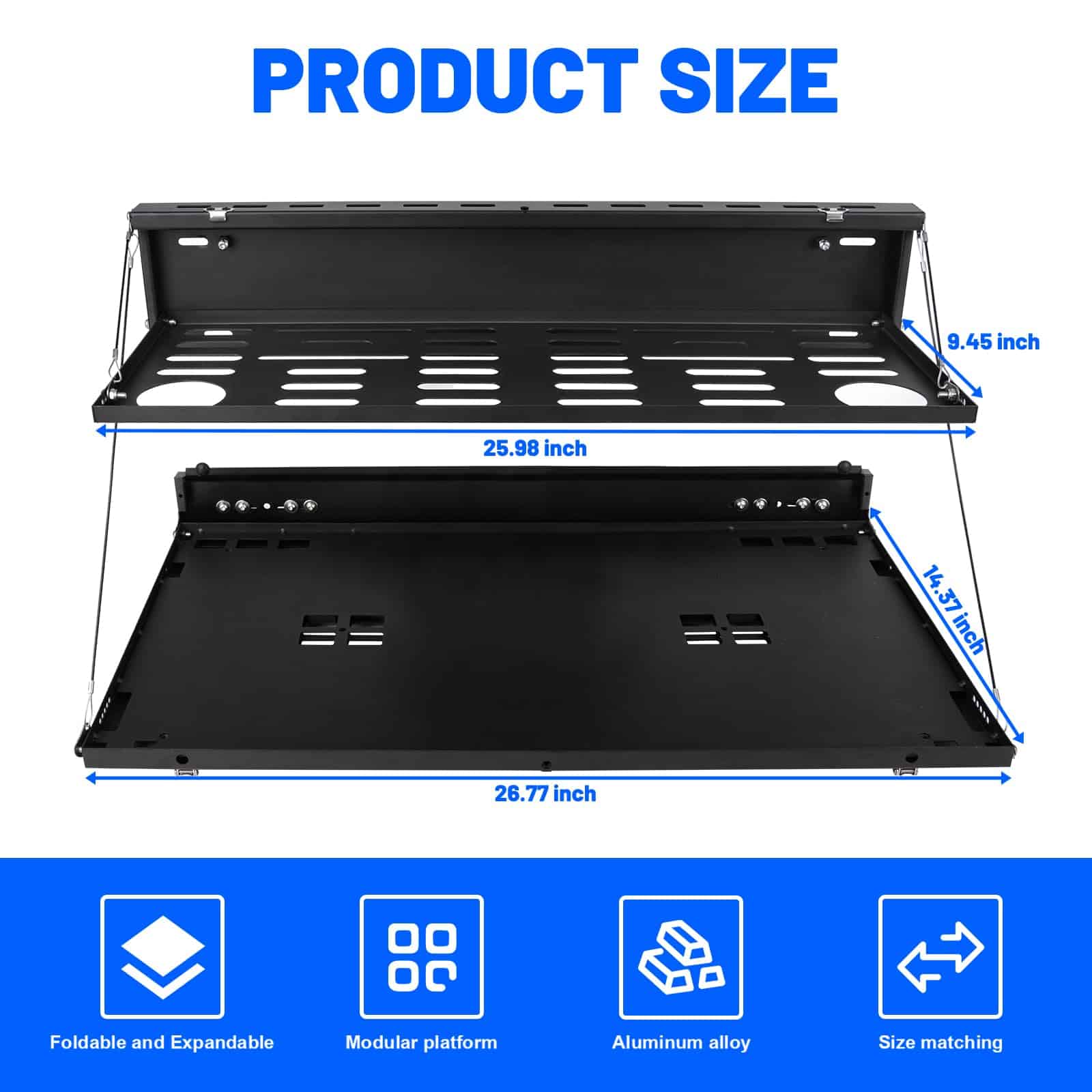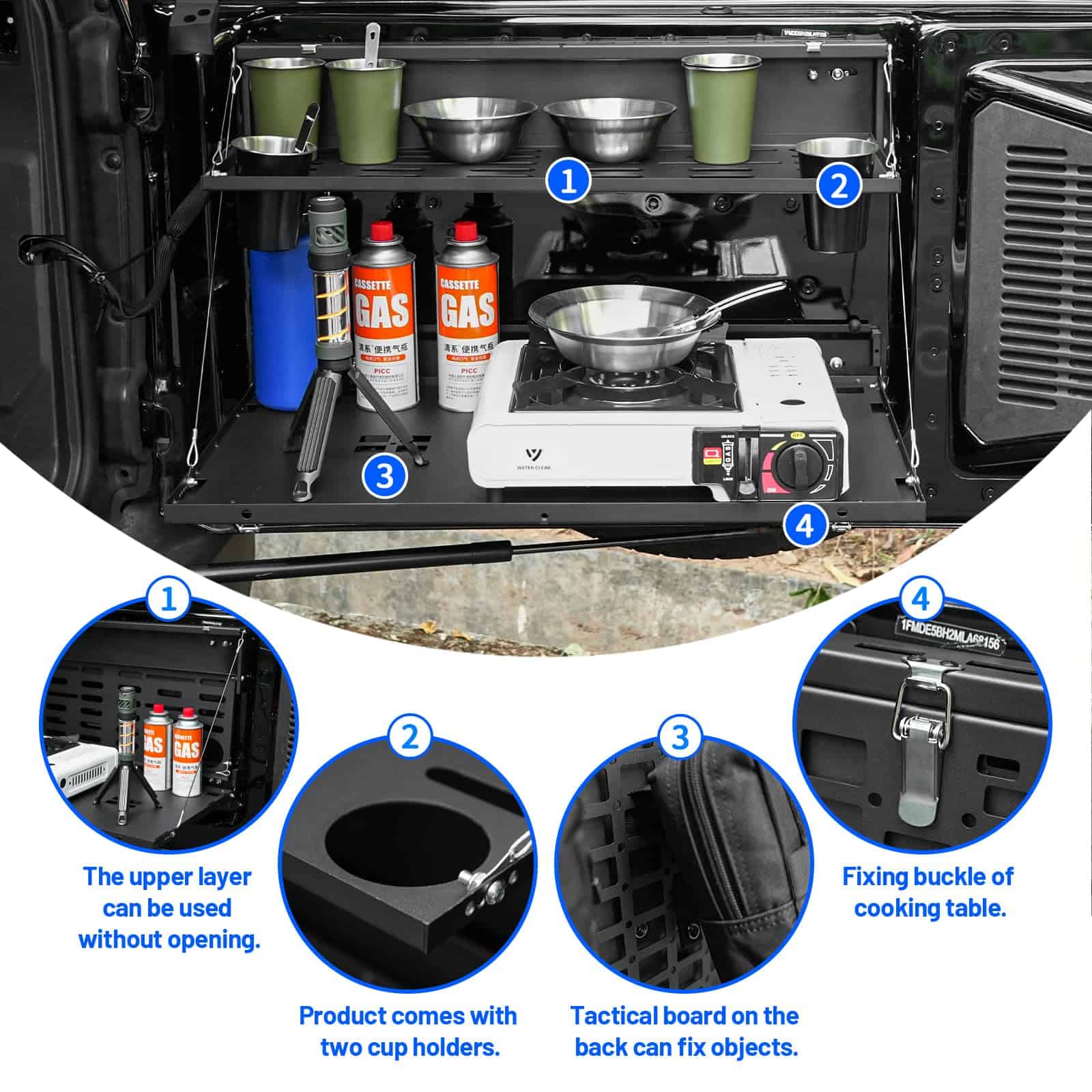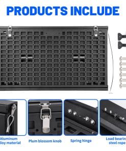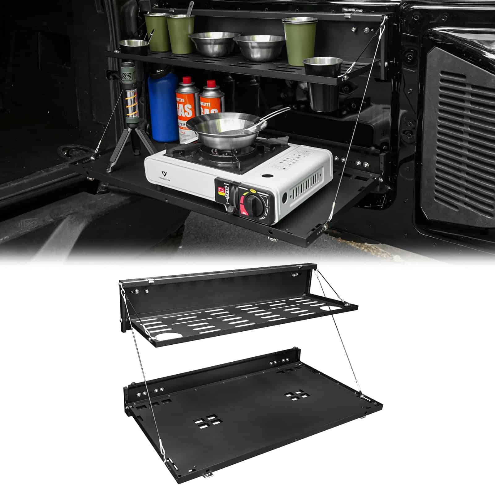 Mesa para puerta trasera paneles Molle para Ford Bronco 2021-2024. Proporciona un ajuste perfecto de la mesa, diseñada según el diseño OEM original del vehículo, perfectamente compatible con la puerta trasera de Ford Bronco 2021-2024. Es un accesorio esencial para actividades de viaje al aire libre y campamento. (No es compatible con Bronco Sport/Badlands). Nueva actualización con tamaño diferenciado de las capas del Panel Molle de 2 Niveles para facilitar el uso simultáneo. Los artículos colocados en la capa superior no obstruirán la vista debajo y no interferirán con el uso de la capa inferior del Panel Molle. En comparación con otros productos similares, nuestro Panel Molle desplegado tiene un área más grande y un diseño de ranura para mayor estabilidad y seguridad al colocar artículos. Además, ofrece un sistema MOLLE de Doble Capa después de plegarse, convirtiendo toda la mesa en un panel molle para sostener bolsas molle, herramientas, extintores de incendios y cualquier cosa compatible con un sistema MOLLE. Esto permite utilizarla como mesa de comedor temporal y banco de trabajo, colocando muchos artículos para un fácil acceso, como computadoras portátiles, alimentos, bebidas, estufas portátiles de campamento y otros utensilios de cocina. El escritorio de la puerta trasera está fabricado con material de alta calidad, aleación de aluminio con recubrimiento en polvo texturizado que brinda resistencia a la oxidación y a la corrosión. El delgado y resistente metal no ocupa espacio en la puerta trasera y soporta un peso de hasta 100 lb. Además, su diseño plegable permite que el estante se pliegue cuando no está en uso, proporcionando una superficie plana para reuniones en la puerta trasera o como una extensión del área de carga. La instalación es sencilla, sin necesidad de taladrar y sin dañar la puerta trasera. Incluye instrucciones y todo el hardware de instalación necesario. Se recomienda seguir los detallados pasos de instalación en la página del producto o contactarnos para recibir orientación. Es importante realizar una instalación correcta para evitar problemas de cierre.