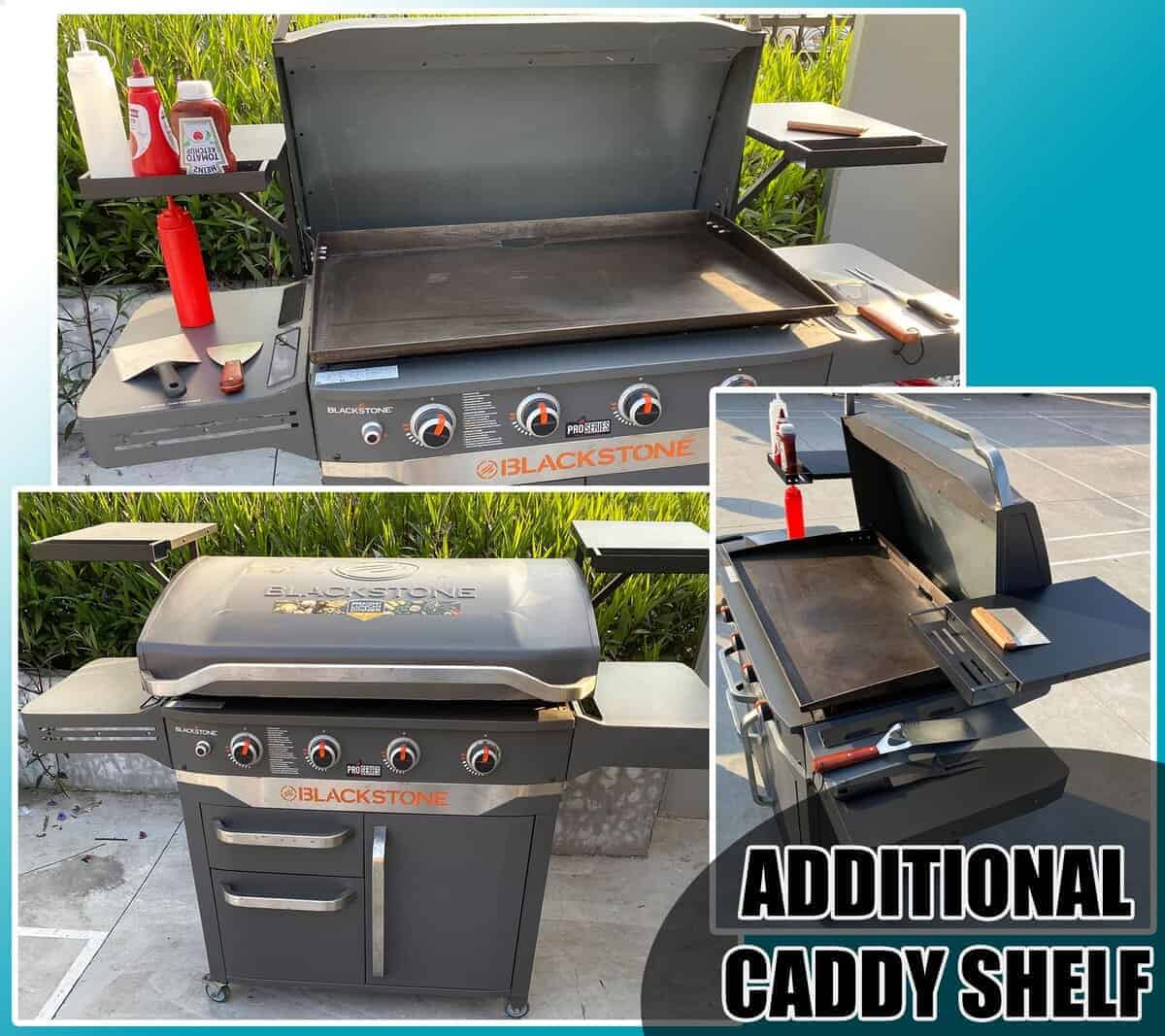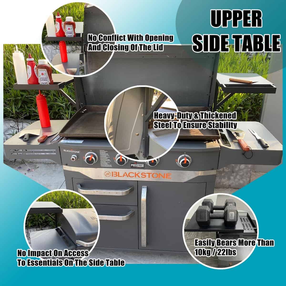 Upgrade your blackstone griddle from having 1 or 2 side shelfs to a larger grilling station with stable upper side tables. The blackstone side table extension provides you additional grilling space, you can keep all your grilling essentials, prep tray and plates within arm’s reach, and without extra grill cart. Say goodbye to knocking over condiments with the included blackstone griddle caddy which enables you to have more storage space for squeeze bottles, sauces and seasoning bottles. It is easier for you to access than the grill carts and side caddy. Our griddle upper shelf is compatible with majority of blackstone 36″/28″/28XL griddle. It can be mounted on the left or right side of the griddle as required. It will not affect your access to the stuffs on the original side table, and there is no conflict with the opening and closing of the lid and cover. Install the blackstone upper shelf can be easily and firmly completed by sharing the griddle side mounting holes. No need to drill holes for this blackstone griddle accessories, and it can easily holds 10kg/22lbs without shaking. The blackstone upper table with grill caddy is made of quality powder coated steel, strong bearing capacity, resistant to oxidation, corrosion and rust. It is a must-have for blackstone enthusiasts.(NOTE: Before purchasing, please check carefully whether the installation structure of original side table meets the installation requirements of our upper shelf to avoid unavailability)