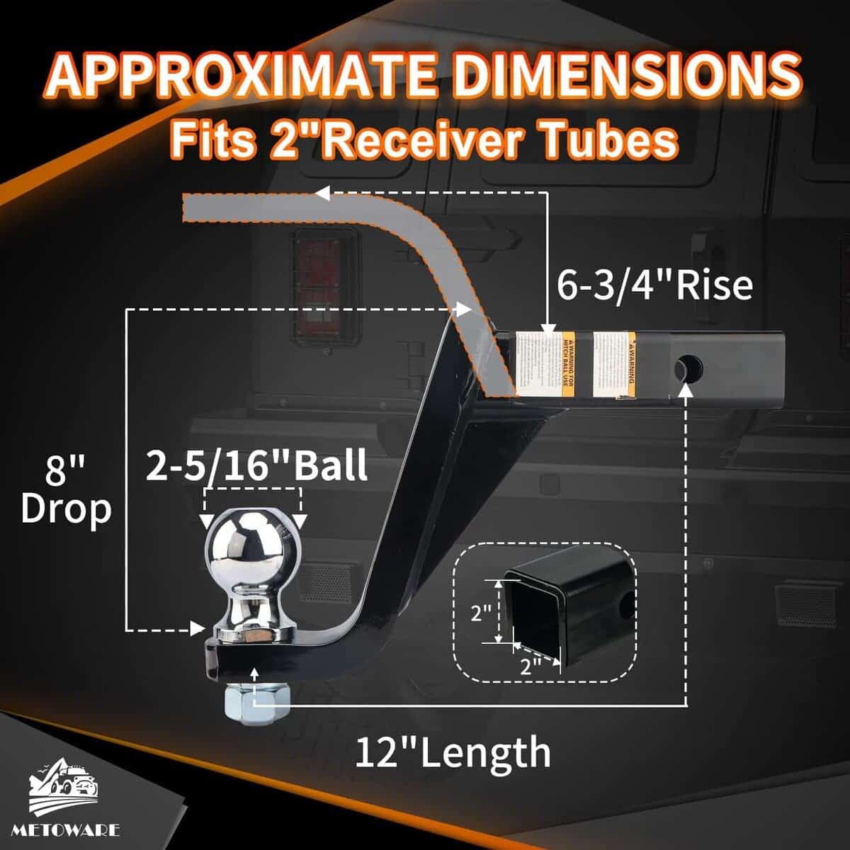 Con una barra de remolque con una gota de 8 pulgadas, diámetro de bola de 2-5/16 pulgadas y agujero de pasador de remolque de 5/8 pulgadas, este accesorio es versátil y se adapta a una amplia variedad de remolques. Antes de la compra, asegúrate de medir la altura del enganche de tu vehículo para garantizar que la gota de 8 pulgadas sea la adecuada.
