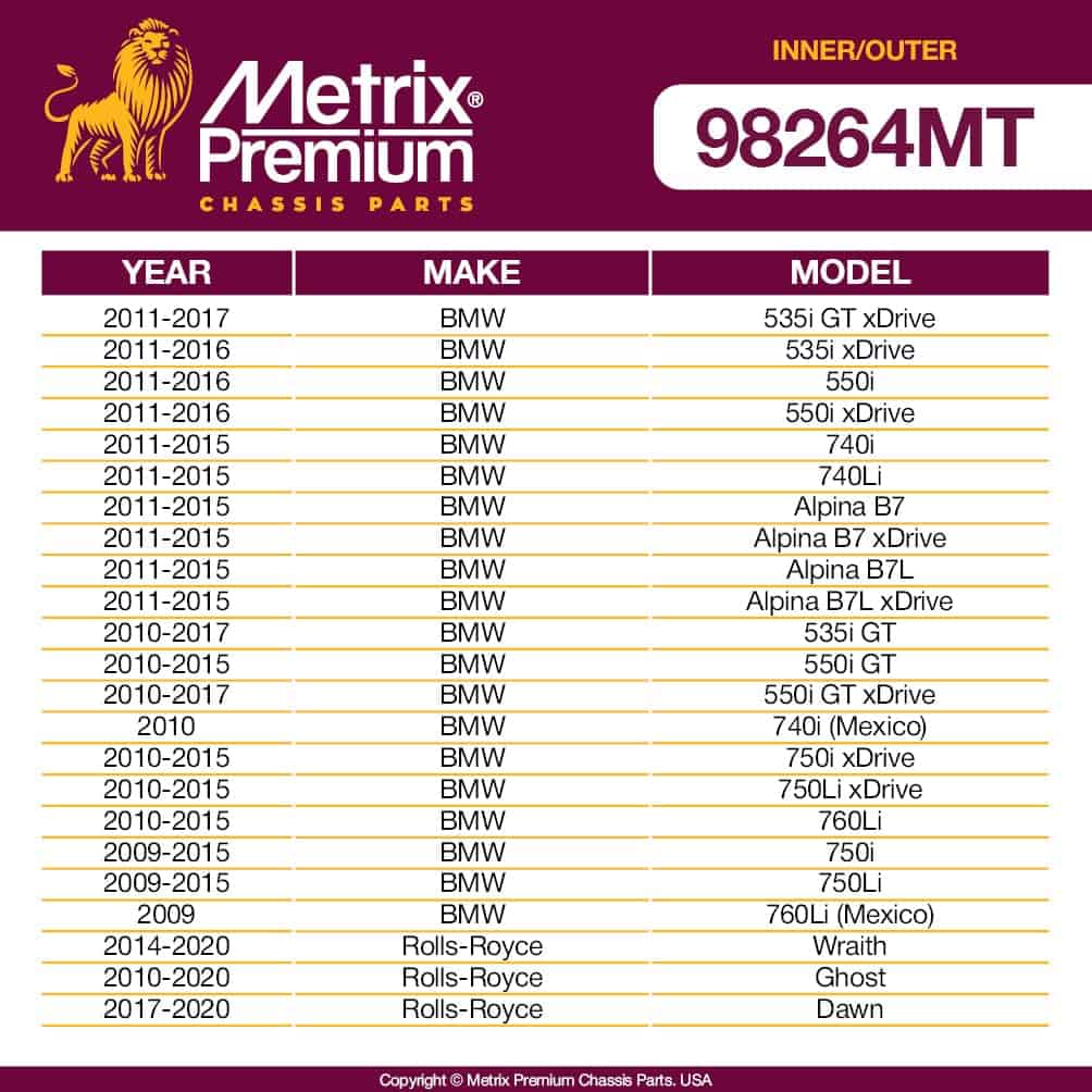 El juego de extremos de barra de dirección interior y exterior Metrix Premium es compatible con una amplia gama de vehículos, incluidos modelos BMW y Rolls-Royce, y está diseñado y fabricado para superar las especificaciones OEM. El kit incluye 2x Extremos de Barra de Dirección Interior delanteros EV800923, 1x Extremo de Barra de Dirección Exterior Derecho delantero ES800914 y 1x Extremo de Barra de Dirección Exterior Izquierdo delantero ES800915, ofreciendo una solución completa para tus necesidades de reparación de vehículos. Con una garantía de garantía de 3 años / 36,000 millas desde la fecha de instalación, este kit de reparación ofrece confiabilidad y tranquilidad tanto para entusiastas del bricolaje como para profesionales. Está fabricado con componentes de acero de alta calidad, algunos con engrasadores para un mantenimiento sencillo y durabilidad. Completo con todo el hardware necesario, este kit garantiza una configuración sólida y confiable. Ha pasado por rigurosas pruebas y cumple con estrictas normas de fabricación para garantizar un rendimiento óptimo. Además, está diseñado con una capa adicional de galvanización catódica para protección contra daños ambientales como sal, suciedad e ingreso de agua, asegurando una mayor protección contra la corrosión.