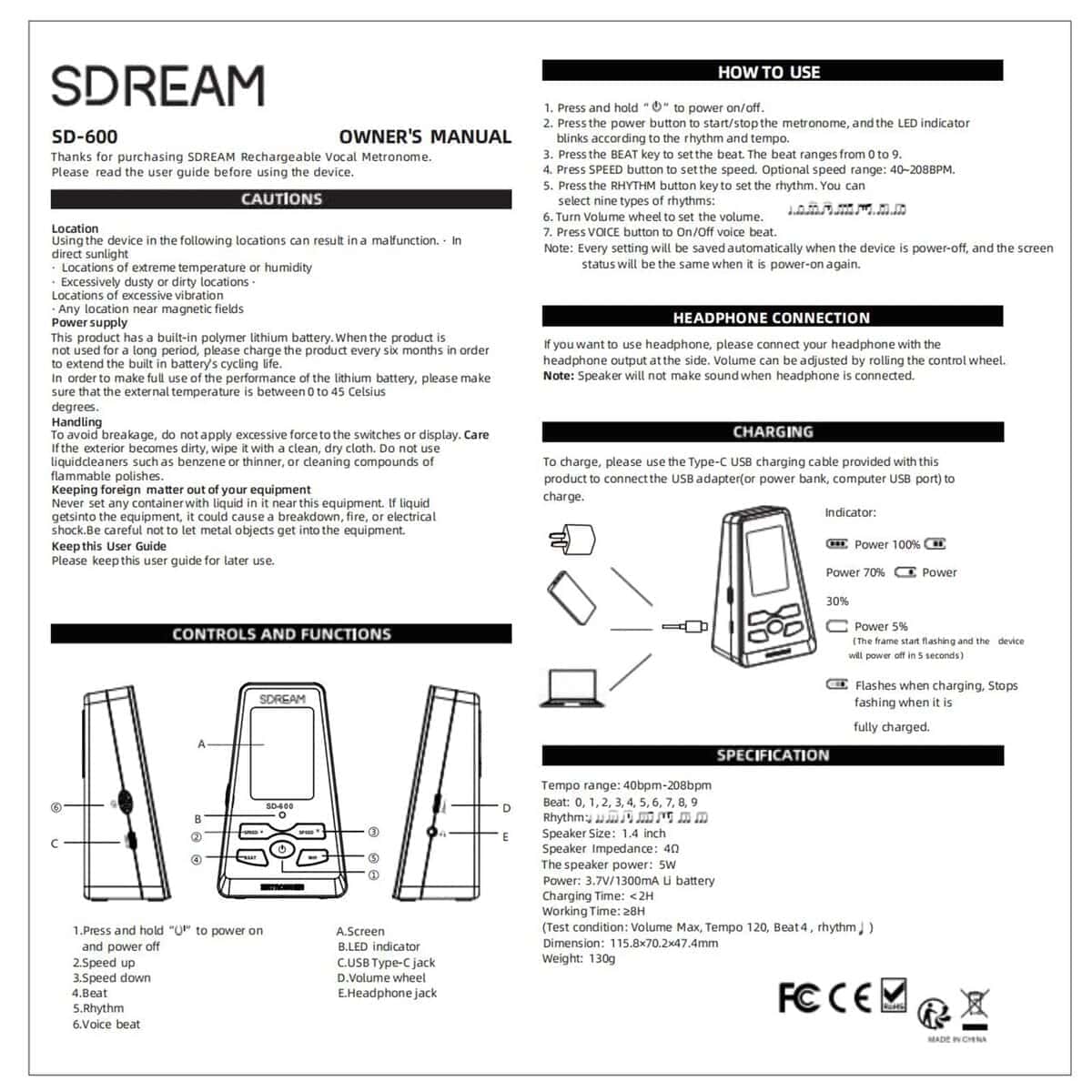 1. Metronomo rico en funciones: Cuenta con dos opciones de voz: voz humana en inglés / golpes de metrónomo electrónico. El metrónomo digital para guitarra tiene 10 patrones de ritmo. Ajuste directo y rápido de la velocidad del metrónomo, el compás, el tempo y el ritmo mediante botones en el metrónomo digital SDREAM. La velocidad tempo se puede ajustar fácilmente en el rango de 40 a 208 pulsos por minuto. 2. Modos recargables: Puedes utilizar el cable de carga Tipo-C proporcionado por la tienda SDREAM para la alimentación, que puede funcionar durante más de 8 horas. También tiene un conector para auriculares de 3,5 mm para una práctica inmersiva sin molestar a otros. 3. Apto para todos los instrumentos: El metrónomo digital SDREAM es muy adecuado tanto para principiantes como para músicos experimentados. 10 patrones de ritmo, incluidos 0, 1, 2, 3, 4, 5, 6, 7, 8, 9, que cumplen los requisitos de todos los instrumentos musicales como piano, guitarra, violín, bajo, ukelele, trompeta, armónica, saxofón, batería, etc. Un metrónomo universal con cuenta vocal es el mejor regalo para familiares y amigos. 4. Compacto y conveniente: Este metrónomo electrónico para piano es del tamaño de una palma y pesa solo 0,29 lb. El metrónomo digital para músicos es compacto y fácil de transportar. Puede colocarse fácilmente en un bolsillo o en una bolsa de instrumentos musicales. Especialmente para aquellos que necesitan practicar o actuar frecuentemente al aire libre, la ventaja de portabilidad del metrónomo digital es más evidente.