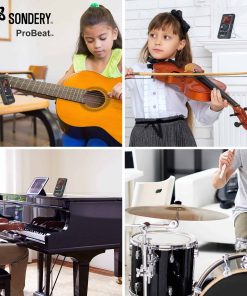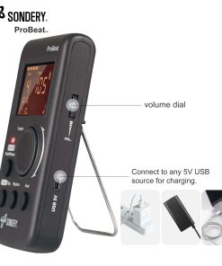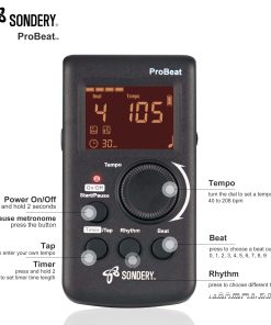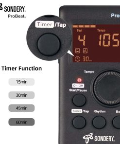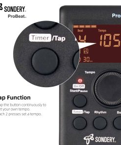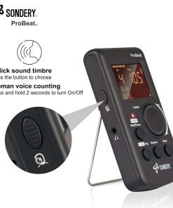 Metronomo digital Sondery vocal con voz de mujer contando. 4 tipos diferentes de sonido digital. Función de toque para ajustar el tempo. Función de temporizador para programar la duración del tiempo de práctica. Ritmo múltiple para opciones. Patrones de Beats 0 – 9. Rango de Tempo 40 – 270 bpm.