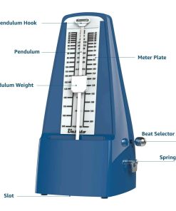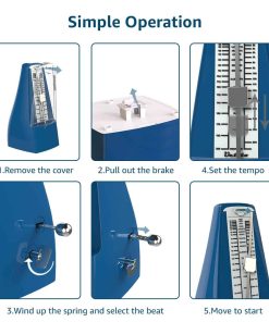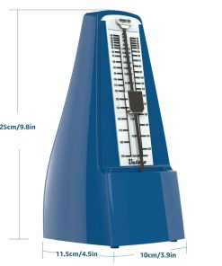 Metrónomo mecánico de color azul, ideal para ayudarte a desarrollar ritmo y mantener el tempo al tocar diferentes instrumentos musicales como el piano, violín, guitarra, saxofón, entre otros. Cuenta con funciones increíbles como clic y timbre audibles, mecanismo de cuerda para producir golpes métricos, rango de tempo de 40 a 208 bpm y selección de tiempo de 0, 2, 3, 4, 6. Fácil de usar, incluso para niños y principiantes, y no requiere baterías. ¡Un accesorio imprescindible para todo músico!