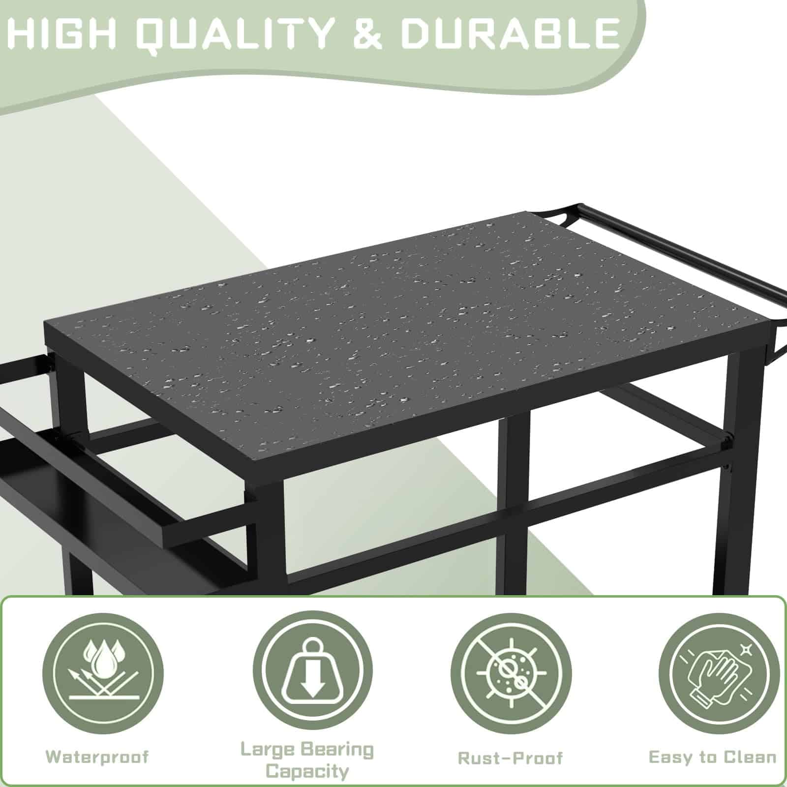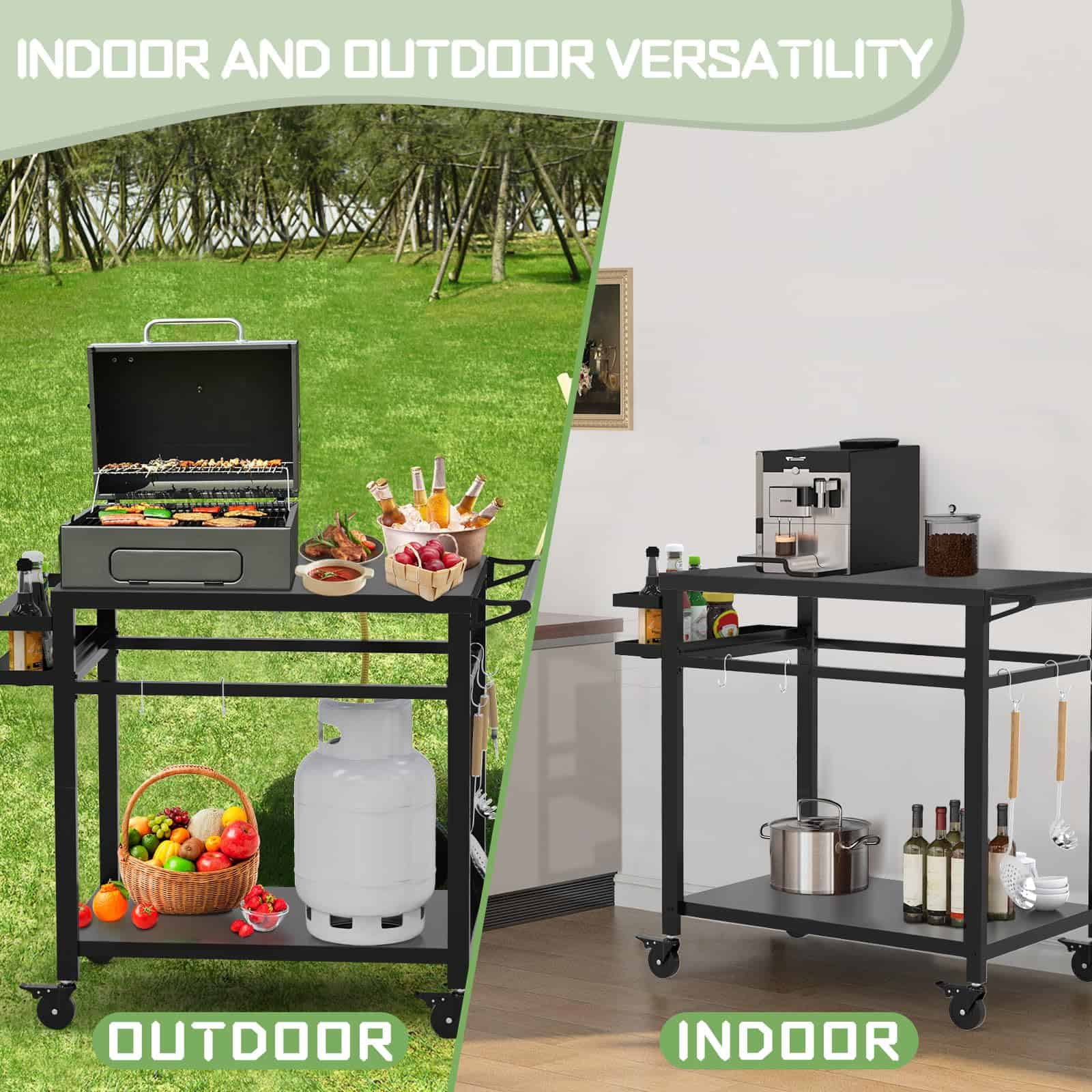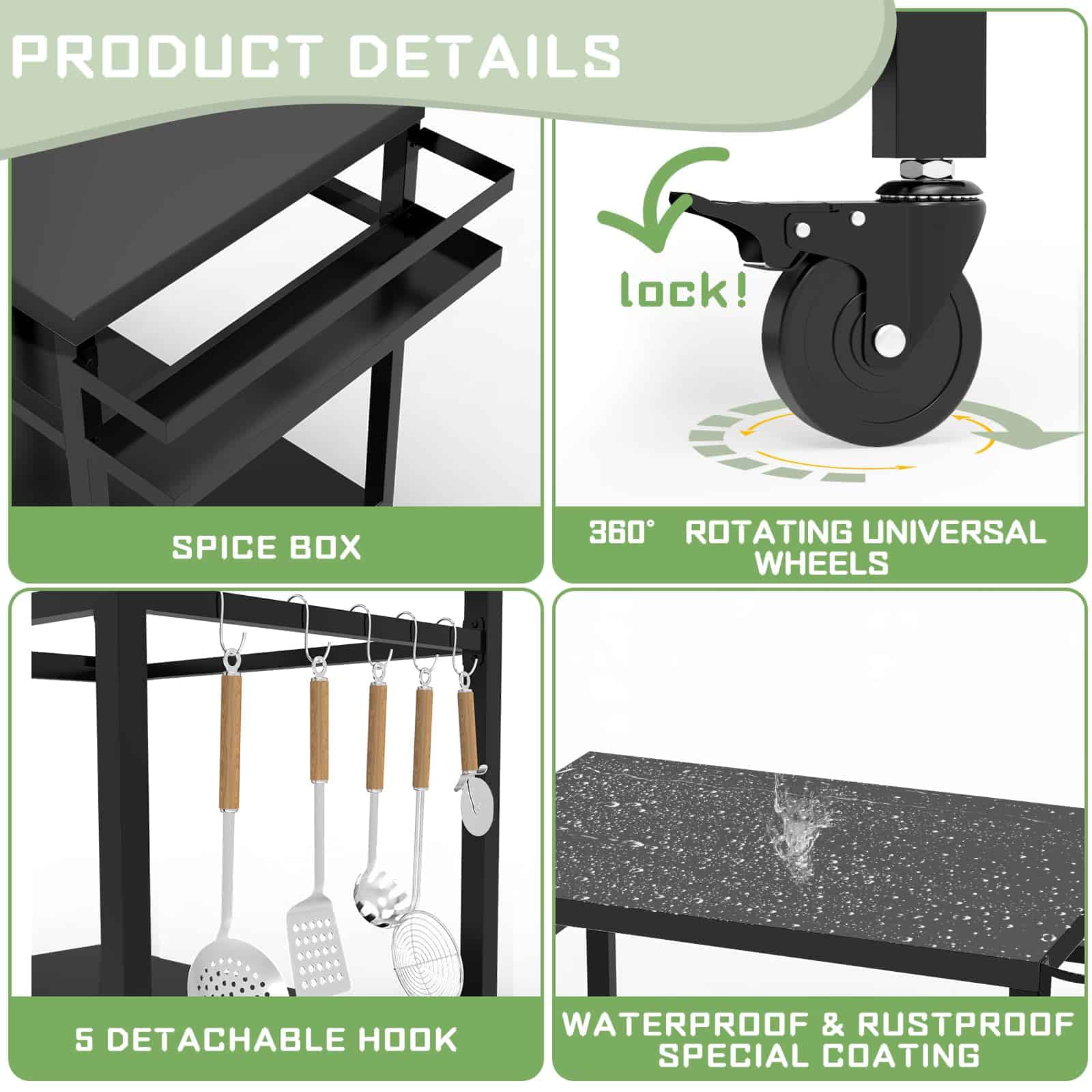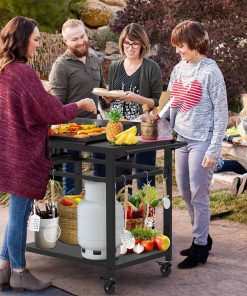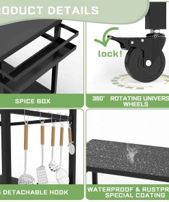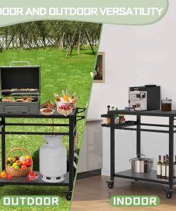 MEXMIODY presenta una Mesa de Parrilla para Exteriores que se convertirá en tu mejor aliado para todas tus actividades al aire libre. Hecha de acero con recubrimiento en polvo resistente a la intemperie, esta mesa/carrto de parrilla es duradera y resistente a la oxidación, lo que la hace perfecta para su uso en el jardín, patio, yarda y en cualquier lugar que desees. Su diseño versátil te permite utilizarla como una isla de cocina exterior, un carrito de bar, estación de preparación para asar, mesa de cocina, mesa para horno de pizza, mesa de preparación de alimentos, mesa de trabajo para barbacoas en fiestas y mucho más. Además, cuenta con una caja de condimentos para mantener tus especias de parrilla ordenadas y al alcance. Para tu comodidad, el carrito de parrilla tiene 4 ruedas giratorias de 360 grados que se mueven fácilmente, con frenos para detenerte donde desees. Su diseño ergonómico de empuje hace que sea fácil de transportar incluso las cargas más pesadas. La instalación es sencilla y viene con instrucciones detalladas. No pierdas la oportunidad de tener esta práctica y versátil mesa de parrilla para disfrutar al máximo de tus reuniones al aire libre.