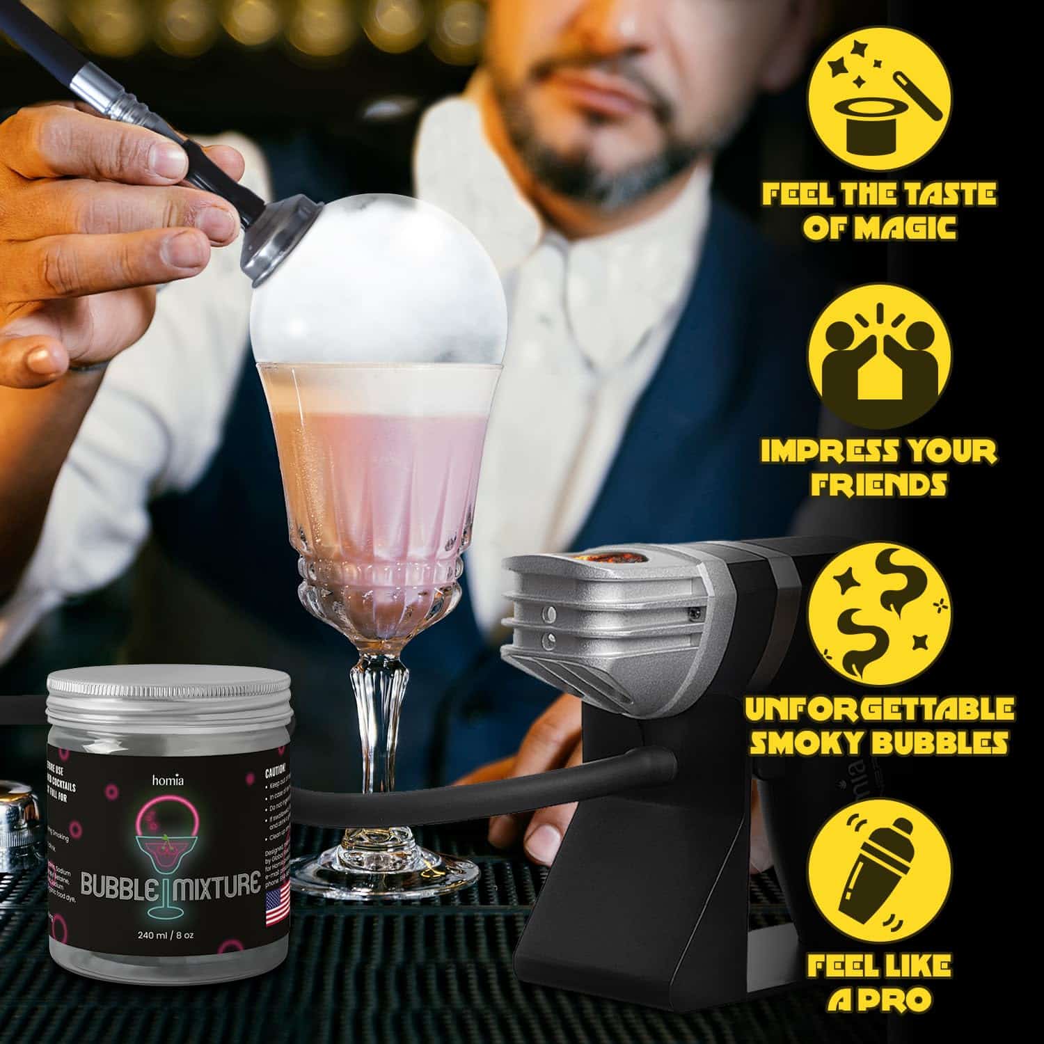 1. PERFECTO PARA AHUMADORES DE BEBIDAS: 8 Oz. Descubra una nueva forma de ahumar cócteles y servir espectaculares. Mezcla de burbujas especialmente creadas para bebidas utilizando ahumador o para crear burbujas de humo y decorar sus bebidas favoritas.