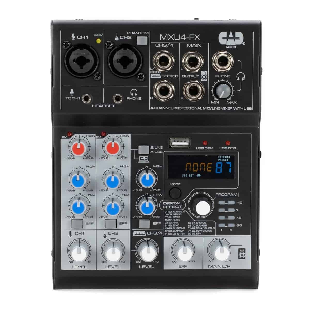 El CAD Audio MXU4-FX es un mezclador analógico multipropósito de 4 canales (2 mic/línea, 2 mono/1 línea estéreo) con una interfaz USB incorporada y procesador de efectos digitales. El ecualizador de 2 bandas y la alimentación phantom de +48V hacen que sea una opción compacta e ideal para actuaciones en vivo.
