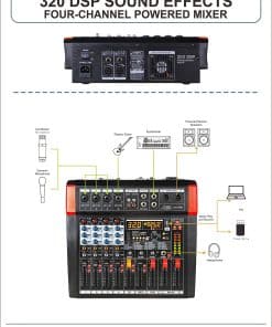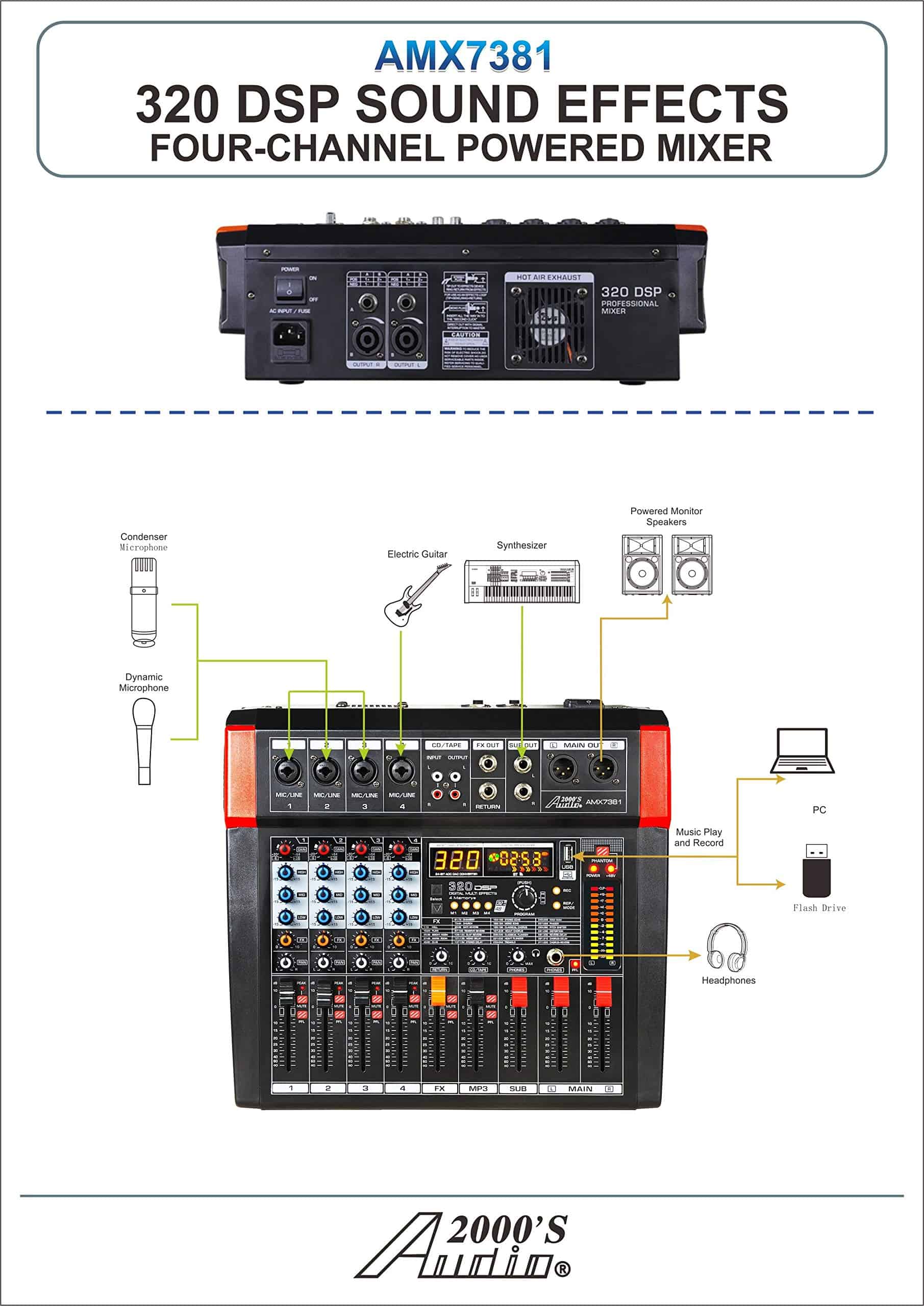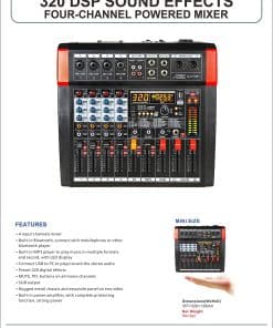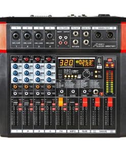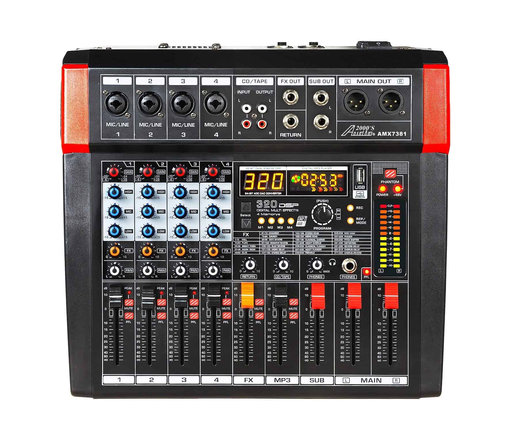 El mezclador de audio AMX7381 de Audio2000’S es verdaderamente fácil de usar, pero con un sonido agradable, mezclador de audio de cuatro canales. La potencia del amplificador integrado es de 150W x 2 @ 4 Ohms. El AMX7381 está configurado con todas las características esenciales de un mezclador. La capacidad de permitir a los usuarios conectar una computadora a la interfaz USB, permite al usuario coordinar este mezclador de audio con una computadora para grabar y/o realizar aplicaciones de reproducción de música. El mezclador de audio AMX7381 incluye entradas de micrófono y de línea estéreo para aplicaciones profesionales de audio. Los efectos de sonido DSP incorporados y las salidas estéreo SUB OUT con control de nivel de SUB OUT fader son características de valor añadido para el mezclador. Los efectos de sonido DSP están configurados con el procesador de 32 bits y el convertidor AD-DA de 24 bits. El mezclador de audio AMX7381 está configurado con perillas de control de Ganancia, FX y PAN en cada canal. Además, cada canal está configurado con la ecualización Ultra Musical de Hi/Mid/Lo de 3 bandas, indicador LED de pico, botón de silencio, botón PFL y fader de control de nivel. Los indicadores de nivel de alta precisión permiten a los usuarios monitorear los niveles de señal de audio. Una alimentación fantasma integrada se puede utilizar para alimentar micrófonos de condensador.
