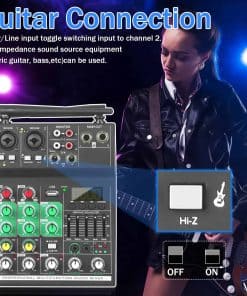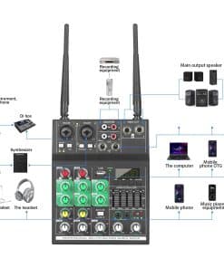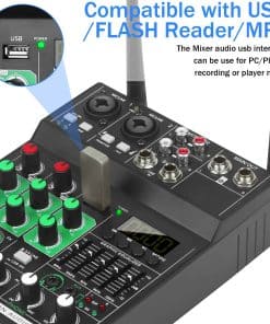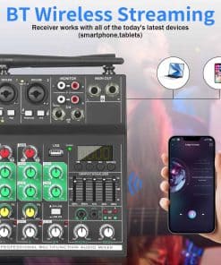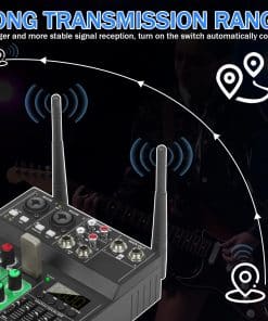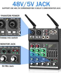 Mezclador de Audio de 4 Canales, Profesional con Doble Micrófono Inalámbrico, Consola de Mesa de Sonido Interface DJ Mixer BT USB MP3 Entrada de Computadora 48V Phantom Power, Apto para DJ Karaoke Guitarra. El dispositivo ofrece una gran conectividad con sus 4 canales que permiten la conexión de múltiples dispositivos. Cuenta con 2 entradas de micrófono XLR, 2 pares de entradas RCA (L/R), 1 par de salidas de grabación RCA y 2 salidas de 1/4 (L/R). Además, es compatible con USB/lector de tarjetas/MP3, lo que permite a los usuarios conectar un USB externo o una unidad flash para transmitir música al mezclador. La función BT también es destacable, ya que permite la transmisión inalámbrica de música desde teléfonos inteligentes para mezclar música. Este mezclador de audio de 4 canales viene con 2 micrófonos inalámbricos UHF de mano, la distancia de recepción es de aproximadamente 180 pies. Cada micrófono tiene 15 grupos de selección de frecuencia, con la frecuencia del micrófono inalámbrico UHF en CHA 576.1-590.1Mhz, CHB 560.1-574.1Mhz. El mezclador también permite la conexión automática de 2 micrófonos al presionar el MIC ON. Los controles de Volumen del micrófono inalámbrico, Eco, Ecualización, Ganancia están disponibles en el Canal No.2. Además, la transferencia de música inalámbrica BT 4.2 tiene un rango de transmisión de hasta 180 pies. No pierda la oportunidad de adquirir este fabuloso mezclador que incluye 1 Mezclador, 2 Micrófonos de mano, 1 cable de alimentación, 1 adaptador de corriente de 5V2A, 1 cable USB a USB, 2 anillos de protección de micrófono y 1 manual. Todo lo que necesita para disfrutar de una experiencia de mezcla excepcional.
