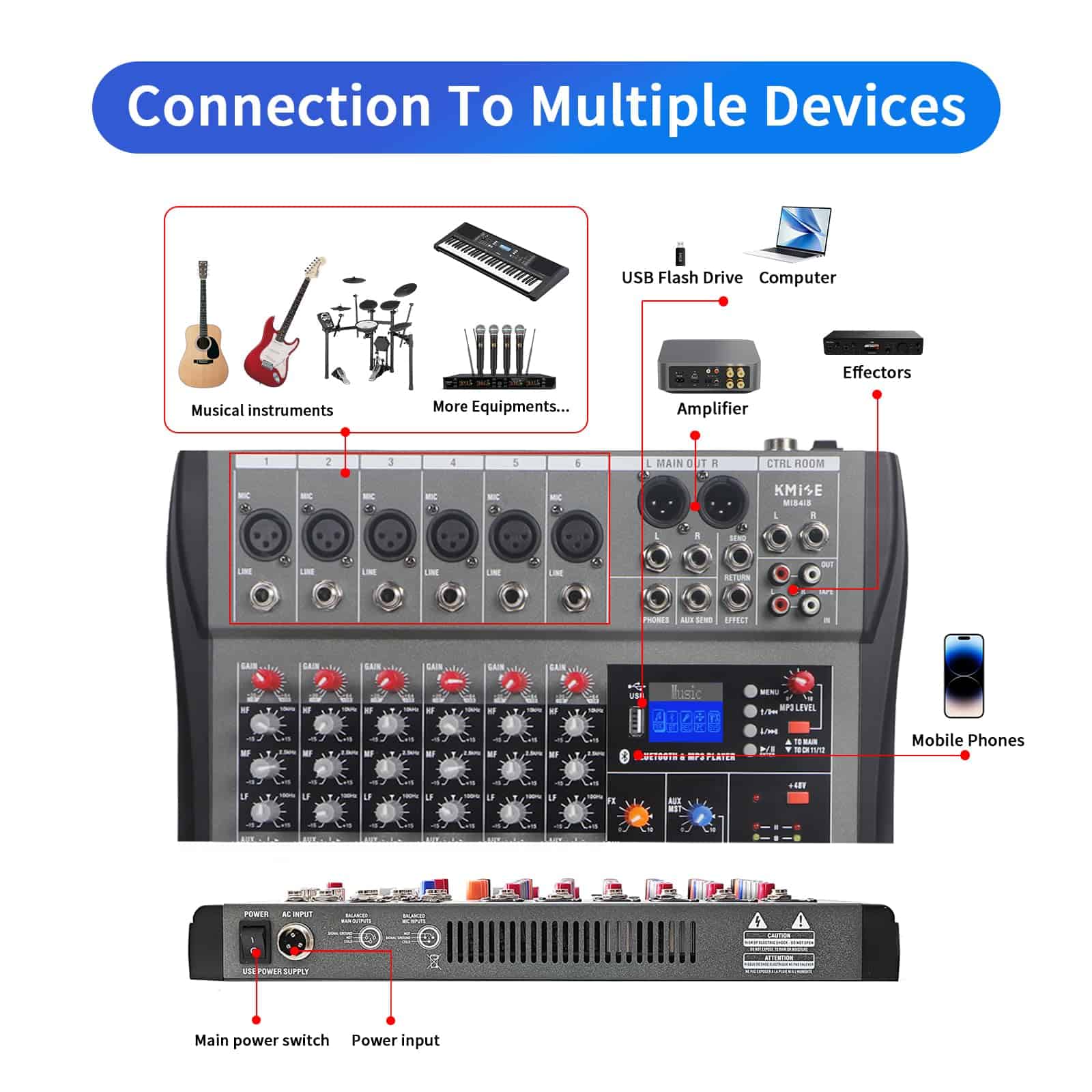 Compatibilidad con Múltiples Dispositivos: USB/Flash Reader/MP3 o dispositivos BT son muy fáciles de conectar a este mezclador para mezclar y grabar; Los controles incorporados ofrecen una experiencia amigable para reproducir/pausar, saltar pistas y cambiar entre modos.